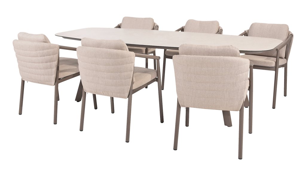 Der Taste 4SO Barolo ist einzigartig. Die gesteppte Rückenlehne verleiht dem Stuhl eine besondere Note und bietet wunderbar weichen Sitzkomfort. In Kombination mit dem eleganten, pulverbeschichteten Aluminiumgestell in Terre-Optik und dem stilvollen grauen Seil, das die Kissen umgibt, schafft der Stuhl eine ruhige und stilvolle Optik, die perfekt in jeden modernen Garten passt. Die hellgrauen Kissen runden das Gesamtbild ab und laden zu langen, gemütlichen Abenden im Freien ein. Neben dem Gartenmöbelset ist in dieser Serie auch ein Lounge-Set erhältlich, um das Outdoor-Erlebnis abzurunden.