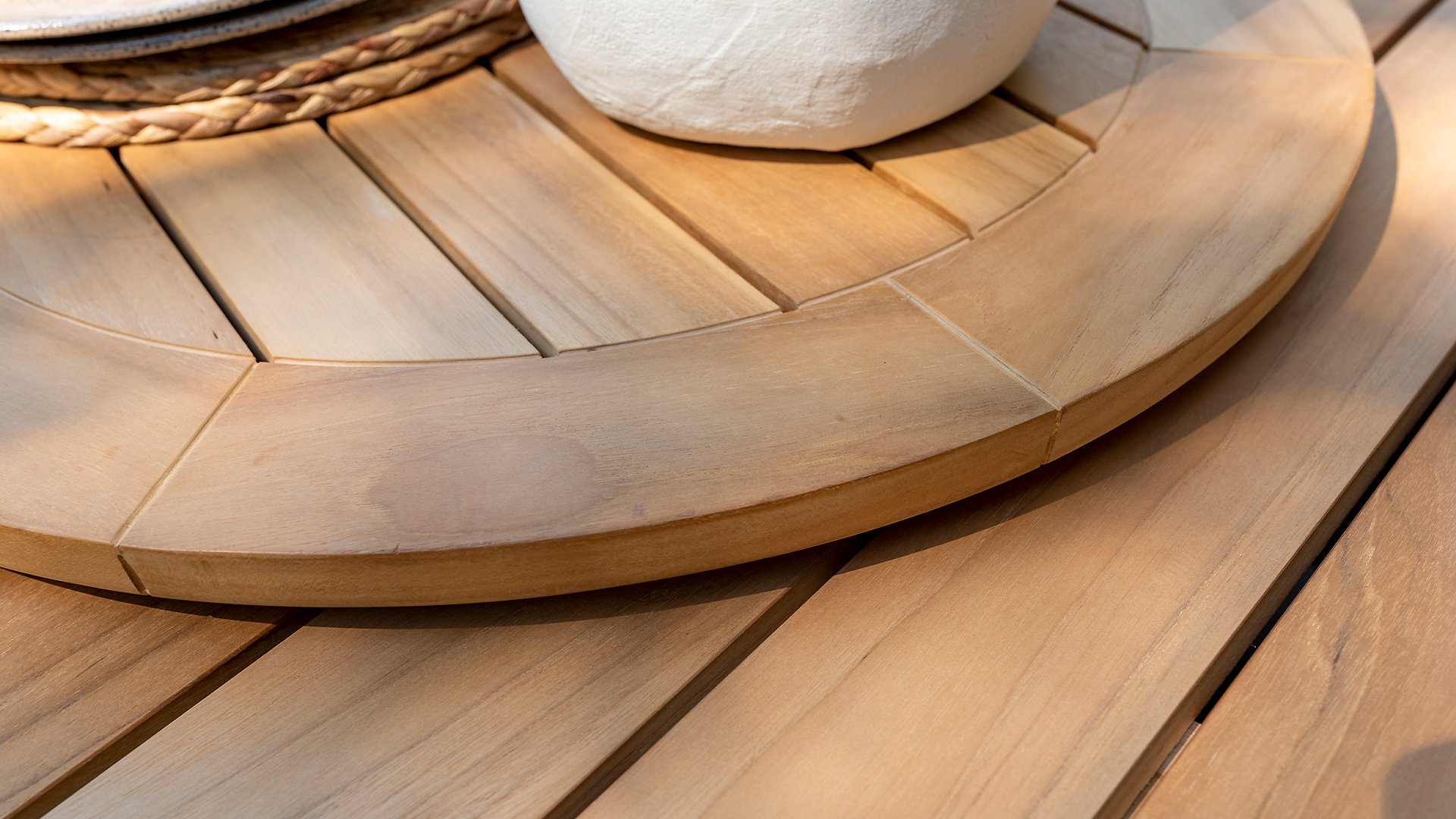 Teakholz eignet sich besonders gut für den Einsatz im Außenbereich. Es ist resistent gegen Schädlinge und Pilze und widerstandsfähig gegen Sonne, Regen und Schnee. Mit der Zeit entwickelt das Teakholz eine silbergraue Patina.