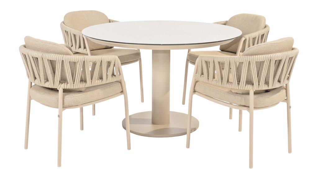 Lernen Sie Taste Sarah kennen, den runden Tisch, der Eleganz und Funktionalität mühelos vereint. Dieser schöne Tisch ist ein echter Hingucker in jedem Garten oder Essbereich. Sein rundes Design schafft eine gemütliche, einladende Atmosphäre, in der alle am Tisch in Kontakt bleiben. Die hochwertig bedruckte Keramikplatte sorgt nicht nur für eine luxuriöse Optik, sondern ist auch außergewöhnlich robust, kratzfest und pflegeleicht. Das zentrale Bein bietet maximale Beinfreiheit und verleiht dem Tisch einen modernen, luftigen Look. Taste by 4 Seasons Outdoor Sarah ist in zwei Ausführungen und zwei Farben erhältlich. Der Tisch ist in zwei Größen erhältlich: 120x75cm (Dining) und 130x69cm (Low Dining) in den Farben Latte und Terre. Entdecken Sie sie unten: