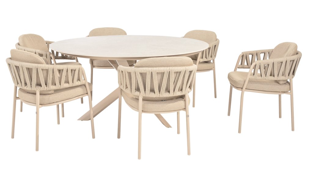 Der Taste by 4 Seasons Outdoor Calma Dining bringt Ruhe in Ihren Garten. In warmem Latte-Ton besticht dieser Stuhl durch ein wunderschön abgerundetes Gestell, das Armlehnen und Rückenlehne nahtlos zu einer fließenden Einheit verschmelzen lässt. Das raffinierte Seilmuster verleiht ihm eine elegante Note, während die weichen Sitz- und Rückenkissen außergewöhnlichen Komfort bieten. Dieser Stuhl ist in zwei Farben erhältlich: Latte und Terre. Er verfügt über bequeme, wetterbeständige Kissen, die sich weich anfühlen und schnell trocknen. So genießen Sie nicht nur den Komfort des Stuhls, sondern auch seine Pflegeleichtigkeit. Die Kissen sind standardmäßig im Lieferumfang enthalten, sodass Sie sofort ultimativen Sitzkomfort genießen können. Zur Calma-Serie gehören auch zwei Lounge-Versionen, ebenfalls in den Farben Latte und Terre.