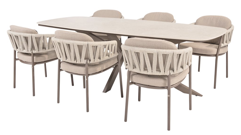Ein wunderschöner, eleganter Tisch mit einer atemberaubenden ovalen Keramikplatte, erhältlich in 240 cm oder 300 cm. Die Platte strahlt nicht nur Eleganz aus, sondern besticht auch durch ihr markantes, modernes Aussehen. Das markante Kreuzbein ist in drei Farben erhältlich, sodass Sie diesen Tisch mühelos an Ihre Bedürfnisse und Vorlieben anpassen können. Ob Industrieschwarz, warmes Latte oder schickes Terre – jede Farbe verleiht dem Tisch einen einzigartigen Charakter und einen Hauch von Luxus. Mit seinen großzügigen Abmessungen bietet dieser Tisch ausreichend Platz für ein gemütliches Essen mit Freunden oder ein intimes Abendessen mit der Familie. Die Kombination aus raffinierter Keramik und dem starken, stilvollen Bein macht diesen Tisch nicht nur funktional, sondern setzt auch ein atemberaubendes Statement in Ihrem Garten.