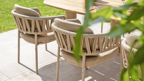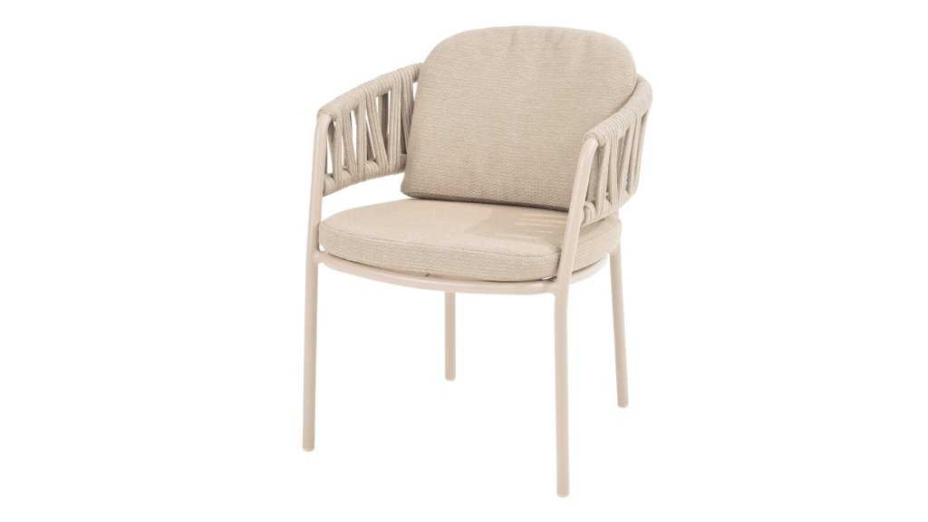 Der Taste by 4 Seasons Outdoor Calma Dining bringt Ruhe in Ihren Garten. In warmem Latte-Ton besticht dieser Stuhl durch ein wunderschön abgerundetes Gestell, das Armlehnen und Rückenlehne nahtlos zu einer fließenden Einheit verschmelzen lässt. Das raffinierte Seilmuster verleiht ihm eine elegante Note, während die weichen Sitz- und Rückenkissen außergewöhnlichen Komfort bieten. Dieser Stuhl ist in zwei Farben erhältlich: Latte und Terre. Er verfügt über bequeme, wetterbeständige Kissen, die sich weich anfühlen und schnell trocknen. So genießen Sie nicht nur den Komfort des Stuhls, sondern auch seine Pflegeleichtigkeit. Die Kissen sind standardmäßig im Lieferumfang enthalten, sodass Sie sofort ultimativen Sitzkomfort genießen können. Zur Calma-Serie gehören auch zwei Lounge-Versionen, ebenfalls in den Farben Latte und Terre.