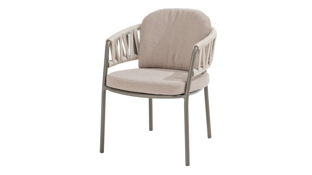 Dieses Esszimmerset vereint edlen Stil mit alltäglichem Komfort. Die schicke Farbe „Terre“ verleiht Ihrem Garten ein gemütliches und stilvolles Ambiente und macht es zum perfekten Ort für entspannte Mahlzeiten und gute Gespräche. Das schlichte Design fügt sich perfekt in jeden Außenbereich ein und bietet Komfort und Charme für jede Zeit im Freien. Dieser Stuhl ist in zwei Farben erhältlich: Latte und Terre. Er verfügt über bequeme, wetterbeständige Kissen, die sich weich anfühlen und schnell trocknen. So genießen Sie nicht nur den Komfort des Stuhls, sondern auch seine Pflegeleichtigkeit. Die Kissen sind standardmäßig im Lieferumfang enthalten, sodass Sie sofort ultimativen Sitzkomfort genießen können. Zur Calma-Serie gehören auch zwei Lounge-Versionen, ebenfalls in den Farben Latte und Terre.