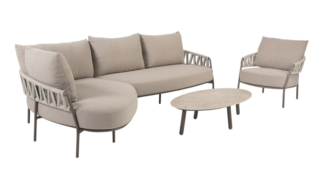 Verleihen Sie Ihrem Garten oder Ihrer Terrasse mit dem Calma Lounge-Set der niederländischen Qualitätsmarke Taste by 4 Seasons Ruhe und Stil. Der Name Calma spiegelt perfekt das Gefühl wider, das dieses Set vermittelt: Entspannung, Komfort und Harmonie. Das Terre-farbene Aluminiumgestell in Kombination mit der graufarbenen Seilstruktur( Rope)  an Rückenlehne und Seitenwänden schafft einen warmen und modernen Look und verwandelt Ihren Garten in eine wahre Wohlfühloase. Das Calma Lounge-Set bietet hervorragenden Sitzkomfort, ideal für lange Sommerabende, entspannte Momente mit einem Buch oder gemütliche Treffen mit Familie und Freunden. Zusätzlich zum Lounge-Set ist die Calma-Serie auch mit einem passenden Calma Esszimmerstuhl erhältlich, sodass Sie Ihren gesamten Außenbereich einheitlich gestalten können. Mit dem Calma Lounge-Set vereinen Sie Stil, Komfort und Langlebigkeit. Das taupefarbene Seil und das Latte-farbene Gestell ergeben zusammen eine ruhige, natürliche Farbkombination, die perfekt zum Namen Calma passt. Schaffen Sie sich Ihr eigenes Outdoor-Paradies und genießen Sie jeden Moment in höchstem Komfort.