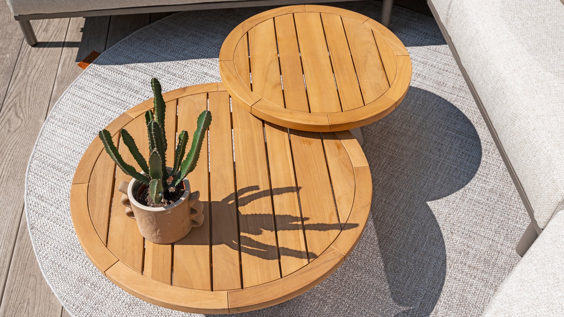 4Seasons Volta Entdecken Sie die Schönheit und Vielseitigkeit des runden Salontischs von 4 Seasons Outdoor Volta mit seiner wunderschönen Teakplatte und dem Edelstahlgestell. Dieser Tisch fügt Ihrer Außenbereich einen Hauch von natürlicher Eleganz hinzu und wurde mit Liebe zum Detail entworfen. Besonders hervorzuheben sind der zentrale Fuß und die robuste Bodenplatte, die diesem Tisch einen enorm stabilen Stand verleihen. Aufgrund der verschiedenen Größen und Farben des Volta-Salon-Tisches können Sie nach Herzenslust kombinieren. Die Volta-Tischserie besteht aus 3 Formaten und 5 Farben Anthrazit, Weiß, Latte, Terre, Olive.