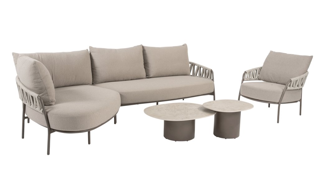 Verleihen Sie Ihrem Garten oder Ihrer Terrasse mit dem Calma Lounge-Set der niederländischen Qualitätsmarke Taste by 4 Seasons Ruhe und Stil. Der Name Calma spiegelt perfekt das Gefühl wider, das dieses Set vermittelt: Entspannung, Komfort und Harmonie. Das Terre-farbene Aluminiumgestell in Kombination mit der graufarbenen Seilstruktur( Rope)  an Rückenlehne und Seitenwänden schafft einen warmen und modernen Look und verwandelt Ihren Garten in eine wahre Wohlfühloase. Das Calma Lounge-Set bietet hervorragenden Sitzkomfort, ideal für lange Sommerabende, entspannte Momente mit einem Buch oder gemütliche Treffen mit Familie und Freunden. Zusätzlich zum Lounge-Set ist die Calma-Serie auch mit einem passenden Calma Esszimmerstuhl erhältlich, sodass Sie Ihren gesamten Außenbereich einheitlich gestalten können. Mit dem Calma Lounge-Set vereinen Sie Stil, Komfort und Langlebigkeit. Das taupefarbene Seil und das Latte-farbene Gestell ergeben zusammen eine ruhige, natürliche Farbkombination, die perfekt zum Namen Calma passt. Schaffen Sie sich Ihr eigenes Outdoor-Paradies und genießen Sie jeden Moment in höchstem Komfort.