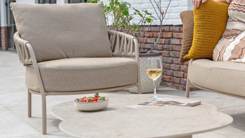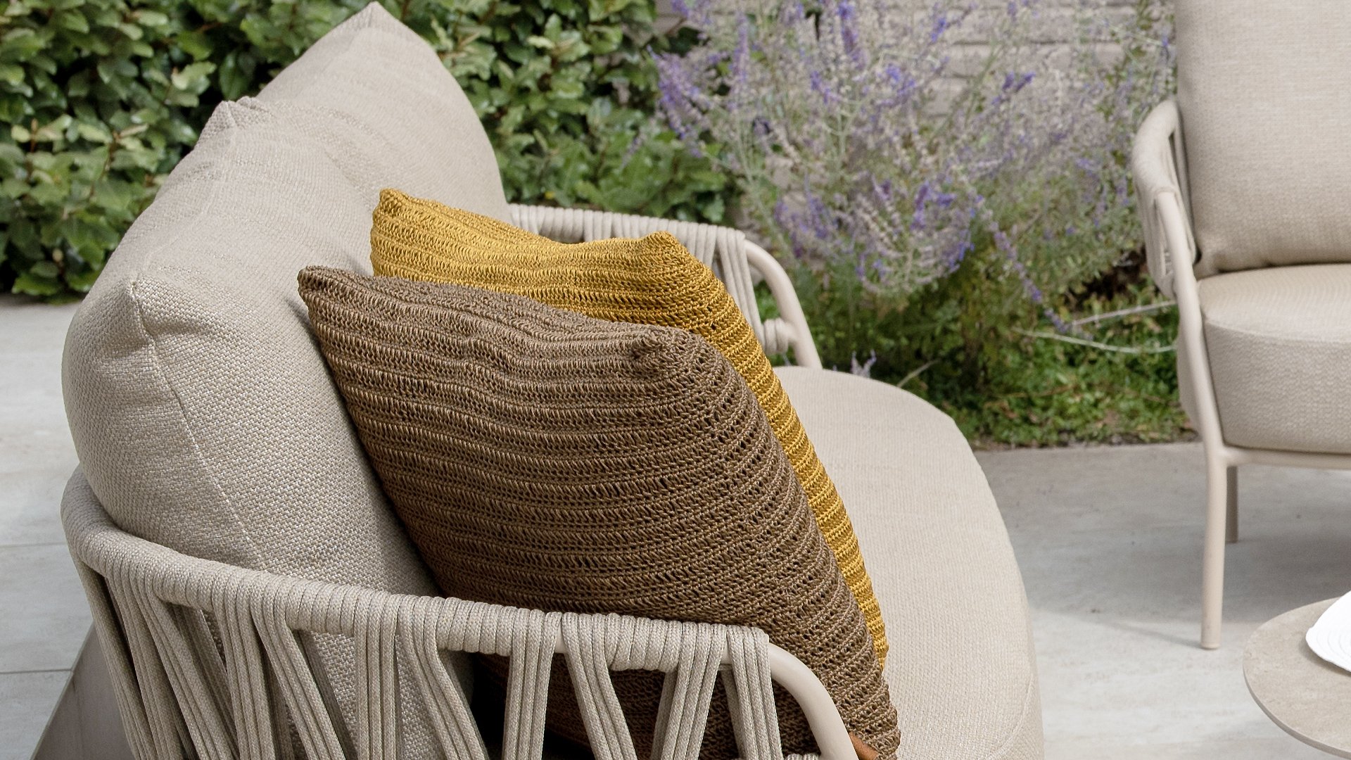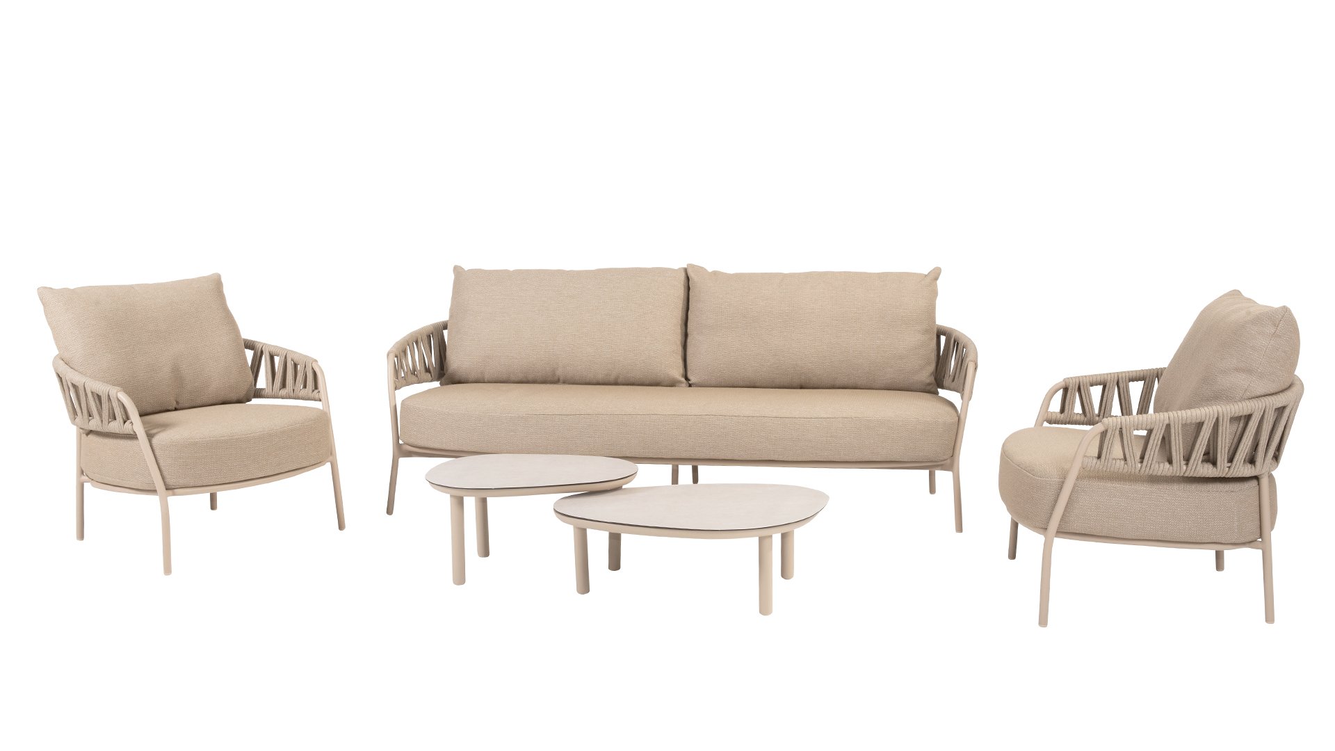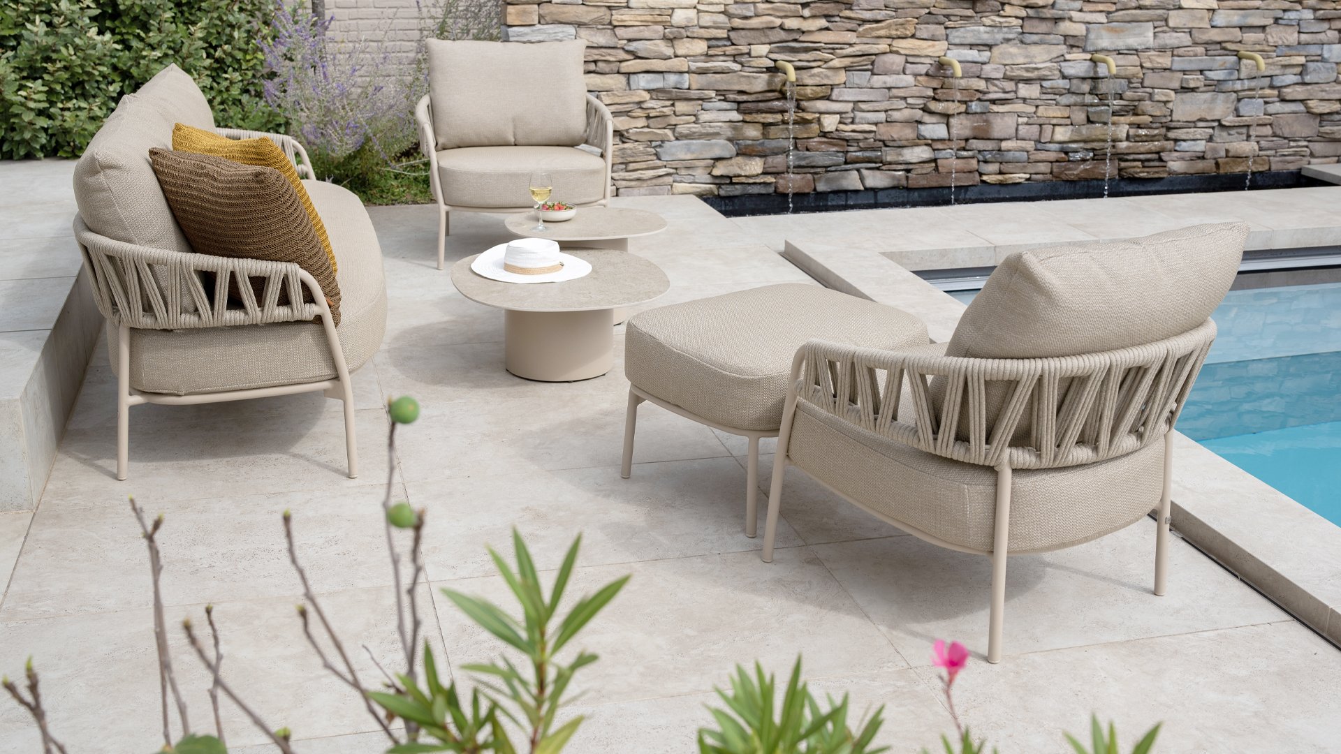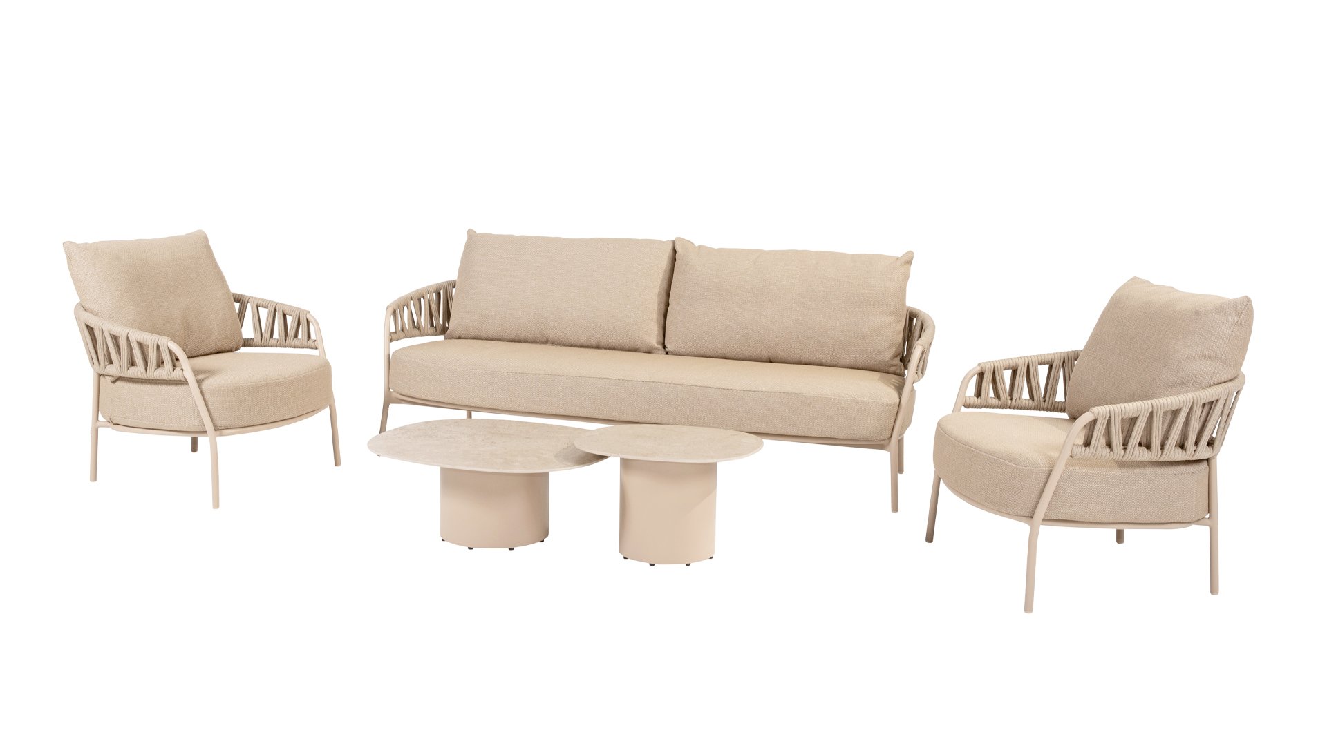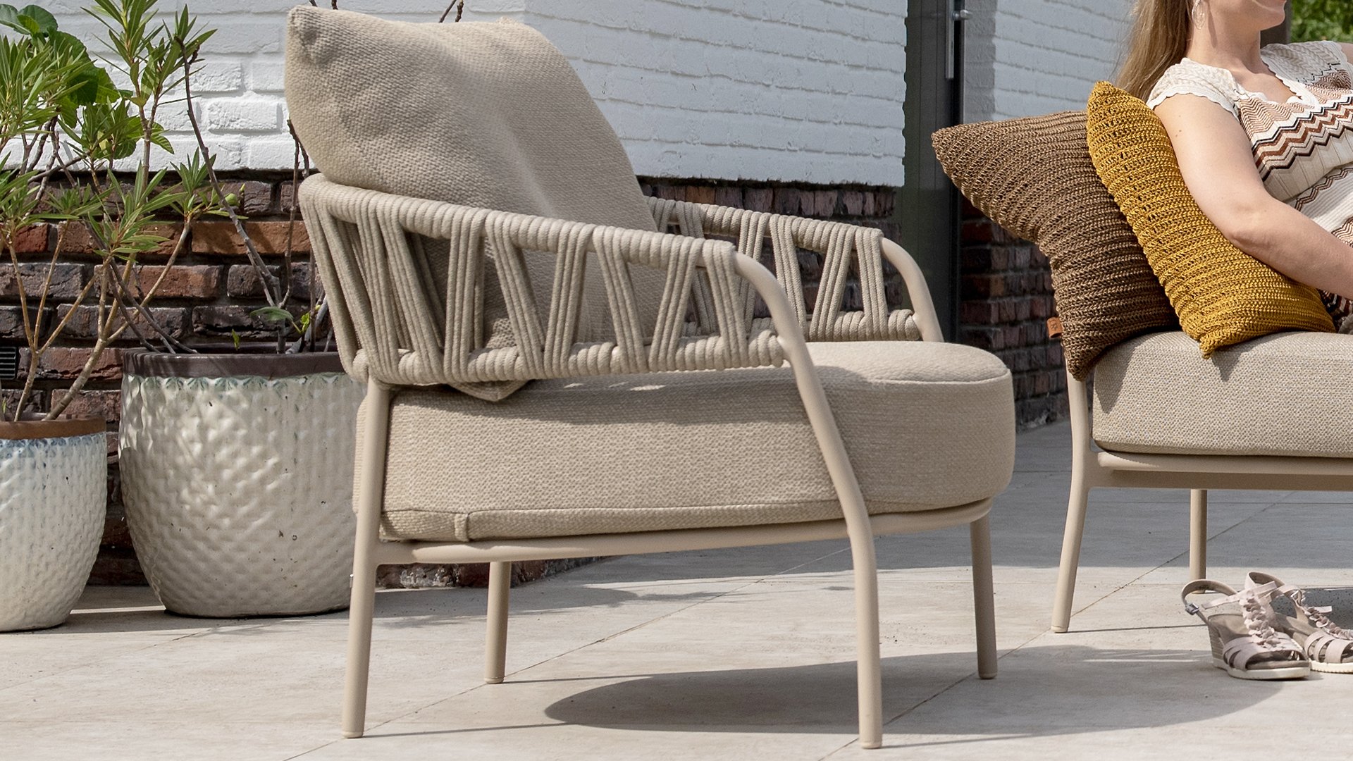 Calma Lounge-Set von Taste by 4 Seasons – Taupefarbenes Seil, lattefarbenes Gestell und höchster Sitzkomfort.