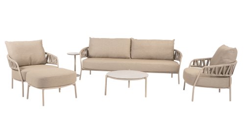 Entdecken Sie das Taste Calma Lounge-Set der renommierten niederländischen Qualitätsmarke Taste by 4 Seasons. Dieses exklusive Lounge-Set wurde für alle entworfen, die höchsten Sitzkomfort mit stilvollem Design verbinden möchten. Der Name Calma ist Programm: Dieses Set bringt Ruhe und Harmonie in Ihren Garten oder auf Ihre Terrasse. Das Besondere an der Calma-Serie ist die taupefarbene Seilstruktur (Rope), die Rückenlehne und Seiten elegant einrahmt, während das lattefarbene Aluminiumgestell für einen modernen, leichten Look sorgt. Zusammen schaffen diese Farben eine warme, natürliche Atmosphäre, die zum Entspannen und Abschalten einlädt. Der hervorragende Sitzkomfort macht es zum idealen Ort für lange Sommerabende oder ruhige Momente mit einem Buch und einem Getränk.