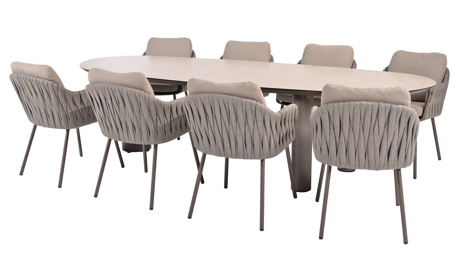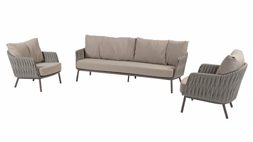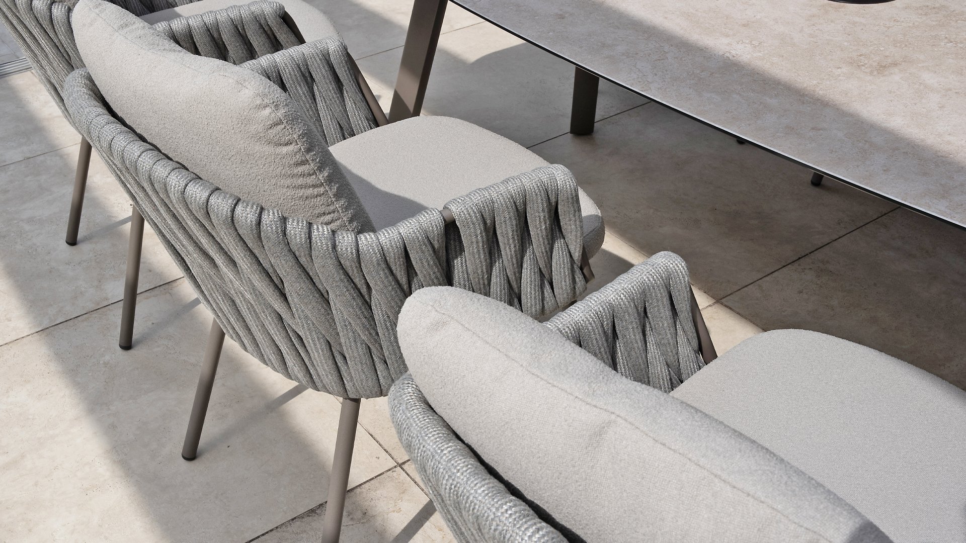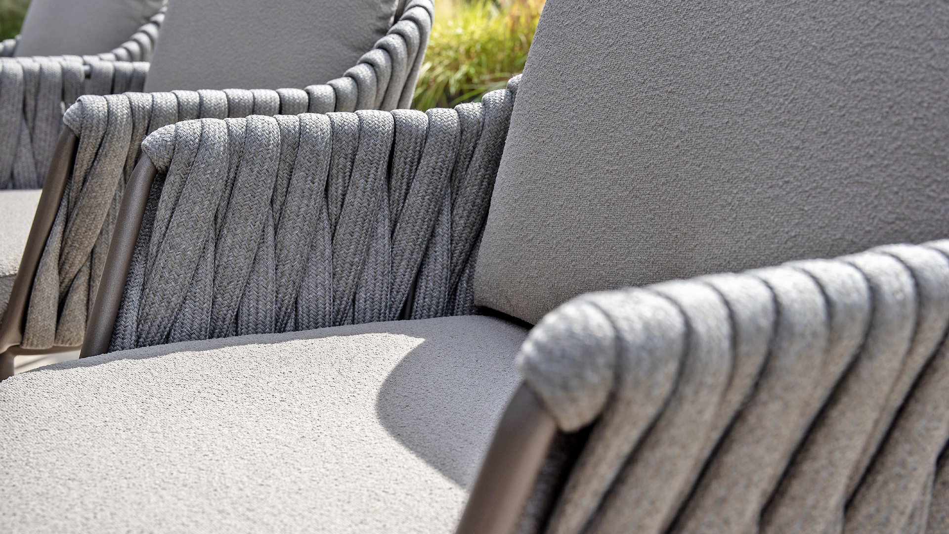 Das elegante, erdfarbene Gestell in Kombination mit dem stilvollen grauen Seilgeflecht verleiht dem Set einen modernen und warmen Look. - Wetterfeste Materialien