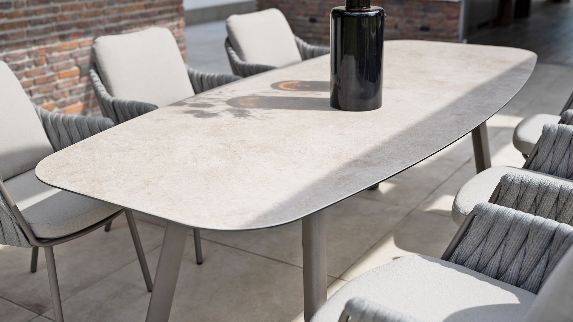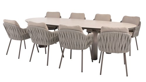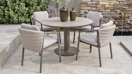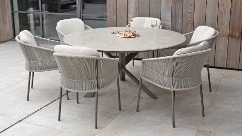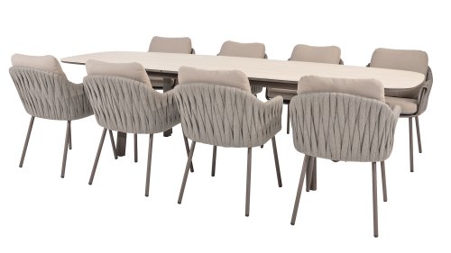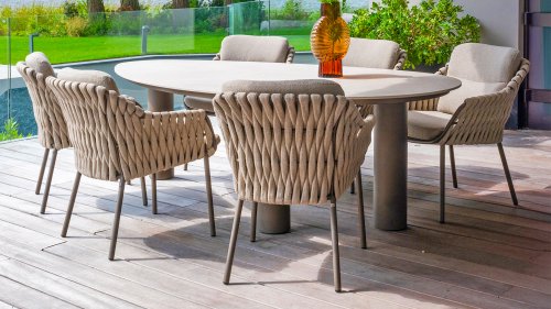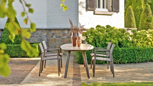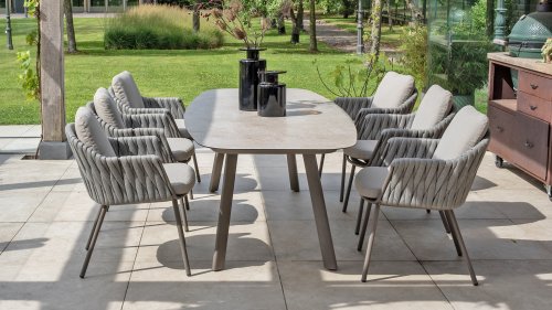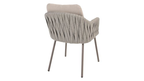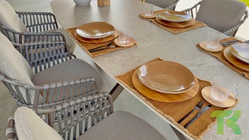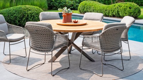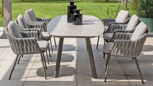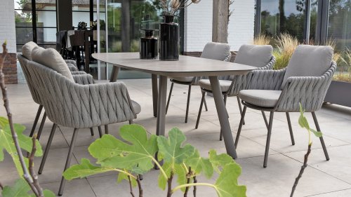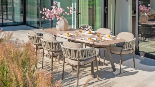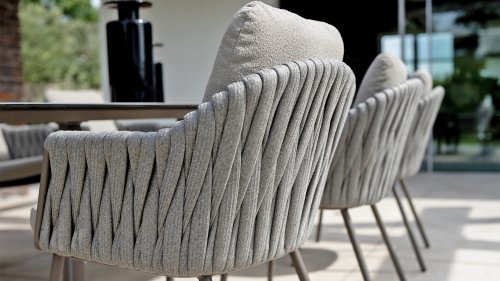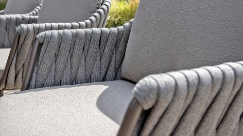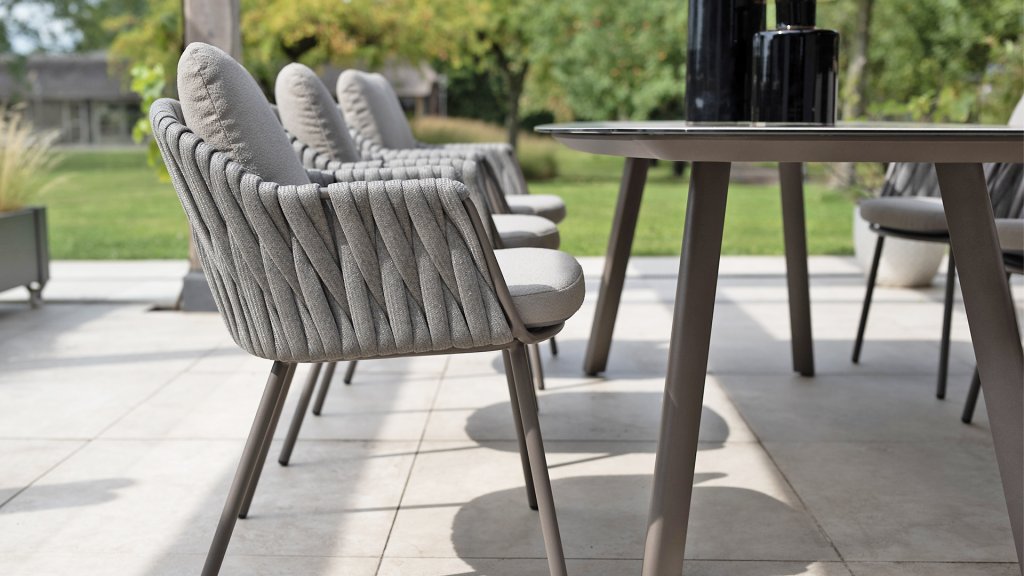 Taste by 4 Seasons Outdoor Cannes Dining – Elegant und modern: Die Gartenmöbelserie Cannes von Taste by 4 Seasons Outdoor verleiht jedem Außenbereich eine raffinierte und ruhige Atmosphäre. Das dezente, erdfarbene, pulverbeschichtete Aluminiumgestell bildet einen schönen Kontrast zum sanften, grauen Seilmuster, das kunstvoll um den Stuhl gewebt ist. Die großzügigen Olefin-Kissen in Hellgrau bieten nicht nur höchsten Sitzkomfort, sondern sind auch wetterfest. Dieses Set ist wie geschaffen für lange Abende mit Essen, entspannten Gesprächen und stimmungsvollen Momenten im Freien. Dank seiner hochwertigen Materialien und der luxuriösen Optik lädt die Cannes-Serie Sie Saison für Saison zum Genießen ein.