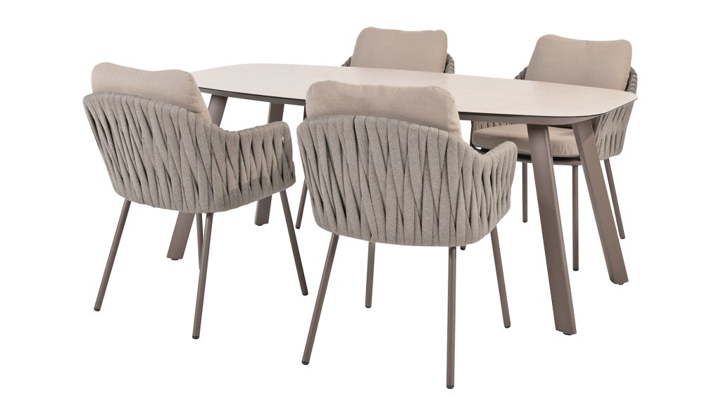 Suchen Sie einen pflegeleichten Tisch mit modernem Look? Dann ist der Taste by 4 Seasons Outdoor Manolo 180 cm genau das Richtige für Sie. Erhältlich in den Farben Anthrazit, Latte und Terre. Die Form der Tischplatte und die Position der Aluminiumbeine machen diesen Tisch unglaublich praktisch. Diese Form schafft großzügigen Platz an allen Seiten. Das markante Design des Tisches zeichnet sich durch eine dänische ovale Tischplatte aus glasbedruckter Keramik aus, sodass er das ganze Jahr über im Freien stehen kann. Der Manolo ist auch in den Größen 75x75x75cm und 240x103x75cm in drei Farben erhältlich.