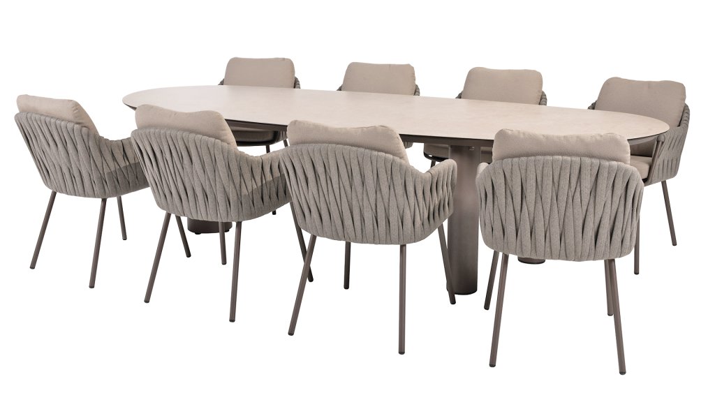 Elegant und modern: Die Gartenmöbelserie Cannes von Taste by 4 Seasons Outdoor verleiht jedem Außenbereich eine raffinierte und ruhige Atmosphäre. Das dezente, erdfarbene, pulverbeschichtete Aluminiumgestell bildet einen wunderschönen Kontrast zum sanften, grauen Seilmuster, das kunstvoll um den Stuhl gewebt ist. Die großzügigen Olefin-Kissen in Hellgrau bieten nicht nur höchsten Sitzkomfort, sondern sind auch wetterfest. Dieses Set ist wie geschaffen für lange Abende beim Essen, entspannte Gespräche und stimmungsvolle Momente im Freien. Mit seinen hochwertigen Materialien und seiner luxuriösen Optik lädt die Cannes Sie Saison für Saison zum Genießen ein. Neben der Essgruppe ist die Taste 4SO Cannes auch als Low Dining-Set, Lounge-Set und High Dining-Set erhältlich, sodass Sie Ihren gesamten Garten im gleichen eleganten Stil einrichten können.