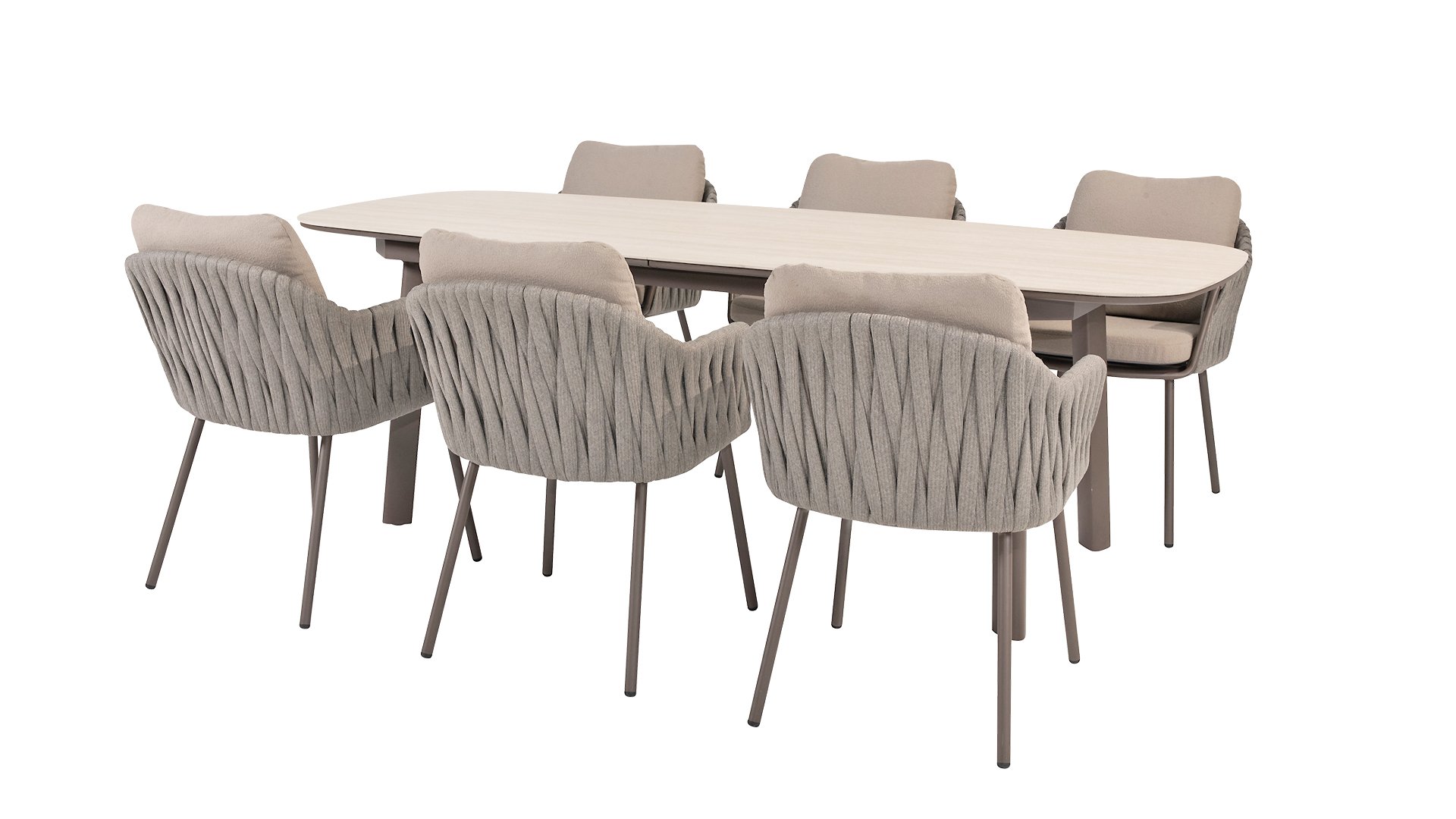 Der Taste Manolo Ausziehtisch ist ein multifunktionales Produkt. Sie erwarten mehr Gäste? Dann lässt sich dieser Tisch auf eine Länge von 290 cm ausziehen. Der Tisch besticht durch seine ovale Tischplatte im dänischen Stil aus glasbedruckter Keramik und kann das ganze Jahr über im Freien stehen. Erhältlich in zwei Farben: Latte und Terre.