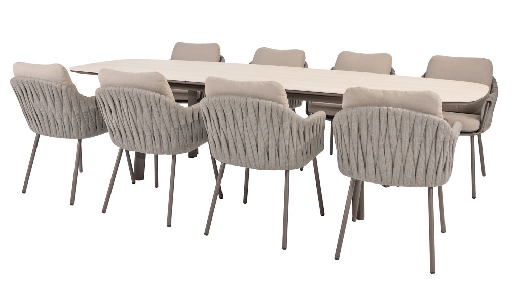 Elegant und modern: Die Gartenmöbelserie Cannes von Taste by 4 Seasons Outdoor verleiht jedem Außenbereich eine raffinierte und ruhige Atmosphäre. Das dezente, erdfarbene, pulverbeschichtete Aluminiumgestell bildet einen wunderschönen Kontrast zum sanften, grauen Seilmuster, das kunstvoll um den Stuhl gewebt ist. Die großzügigen Olefin-Kissen in Hellgrau bieten nicht nur höchsten Sitzkomfort, sondern sind auch wetterfest. Dieses Set ist wie geschaffen für lange Abende beim Essen, entspannte Gespräche und stimmungsvolle Momente im Freien. Mit seinen hochwertigen Materialien und seiner luxuriösen Optik lädt die Cannes Sie Saison für Saison zum Genießen ein. Neben der Essgruppe ist die Taste 4SO Cannes auch als Low Dining-Set, Lounge-Set und High Dining-Set erhältlich, sodass Sie Ihren gesamten Garten im gleichen eleganten Stil einrichten können.