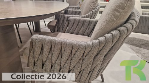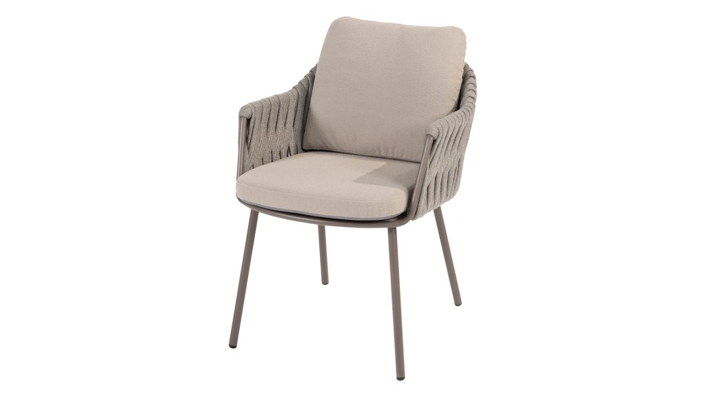 Elegant und modern: Die Gartenmöbelserie Cannes von Taste by 4 Seasons Outdoor verleiht jedem Außenbereich eine raffinierte und ruhige Atmosphäre. Das dezente, erdfarbene, pulverbeschichtete Aluminiumgestell bildet einen wunderschönen Kontrast zum sanften, grauen Seilmuster, das kunstvoll um den Stuhl gewebt ist. Die großzügigen Olefin-Kissen in Hellgrau bieten nicht nur höchsten Sitzkomfort, sondern sind auch wetterfest.