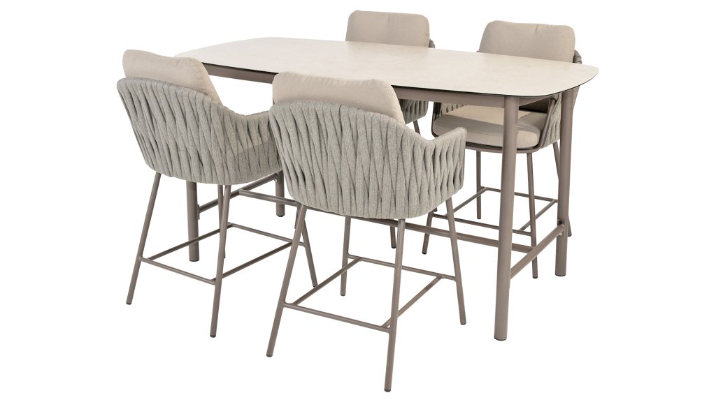 Raffiniert, gehoben und unverwechselbar. Das Cannes High Dining-Set von Taste by 4 Seasons Outdoor hebt das Essen im Freien auf ein neues Niveau. Der dezente, pulverbeschichtete Aluminiumrahmen in Terroir-Farbe bildet einen wunderschönen Kontrast zum elegant gewebten, hellgrauen Seil. Dank der hochwertigen Verarbeitung wirkt das Set modern, warm und einladend. Die großzügigen Olefin-Kissen in Hellgrau bieten eine bequeme, leicht erhöhte Sitzposition, die das luxuriöse High Dining-Erlebnis perfekt ergänzt. High Dining ist eine gehobene Form des Essens im Freien, bei der Tisch und Stühle die Standard-Esstischhöhe überschreiten, aber niedriger als eine Bar-Garnitur sind. Es bietet eine aktive, bequeme Sitzposition und schafft eine luxuriöse, ungezwungene Atmosphäre – ideal für Drinks und stimmungsvolle Dinner. Mit Cannes genießen Sie Stil und Funktionalität Saison für Saison. Neben High Dining ist das Taste 4Seasons Cannes auch als Esstisch Set, Low-Dining Set und Lounge Set erhältlich.