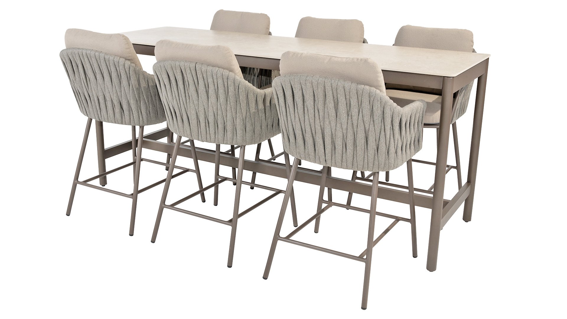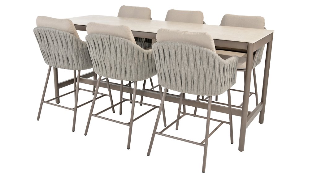 Raffiniert, gehoben und unverwechselbar. Das Cannes High Dining-Set von Taste by 4 Seasons Outdoor hebt das Essen im Freien auf ein neues Niveau. Der dezente, pulverbeschichtete Aluminiumrahmen in Terroir-Farbe bildet einen wunderschönen Kontrast zum elegant gewebten, hellgrauen Seil. Dank der hochwertigen Verarbeitung wirkt das Set modern, warm und einladend. Die großzügigen Olefin-Kissen in Hellgrau bieten eine bequeme, leicht erhöhte Sitzposition, die das luxuriöse High Dining-Erlebnis perfekt ergänzt. High Dining ist eine gehobene Form des Essens im Freien, bei der Tisch und Stühle die Standard-Esstischhöhe überschreiten, aber niedriger als eine Bar-Garnitur sind. Es bietet eine aktive, bequeme Sitzposition und schafft eine luxuriöse, ungezwungene Atmosphäre – ideal für Drinks und stimmungsvolle Dinner. Mit Cannes genießen Sie Stil und Funktionalität Saison für Saison. Neben High Dining ist das Taste 4Seasons Cannes auch als Esstisch Set, Low-Dining Set und Lounge Set erhältlich.