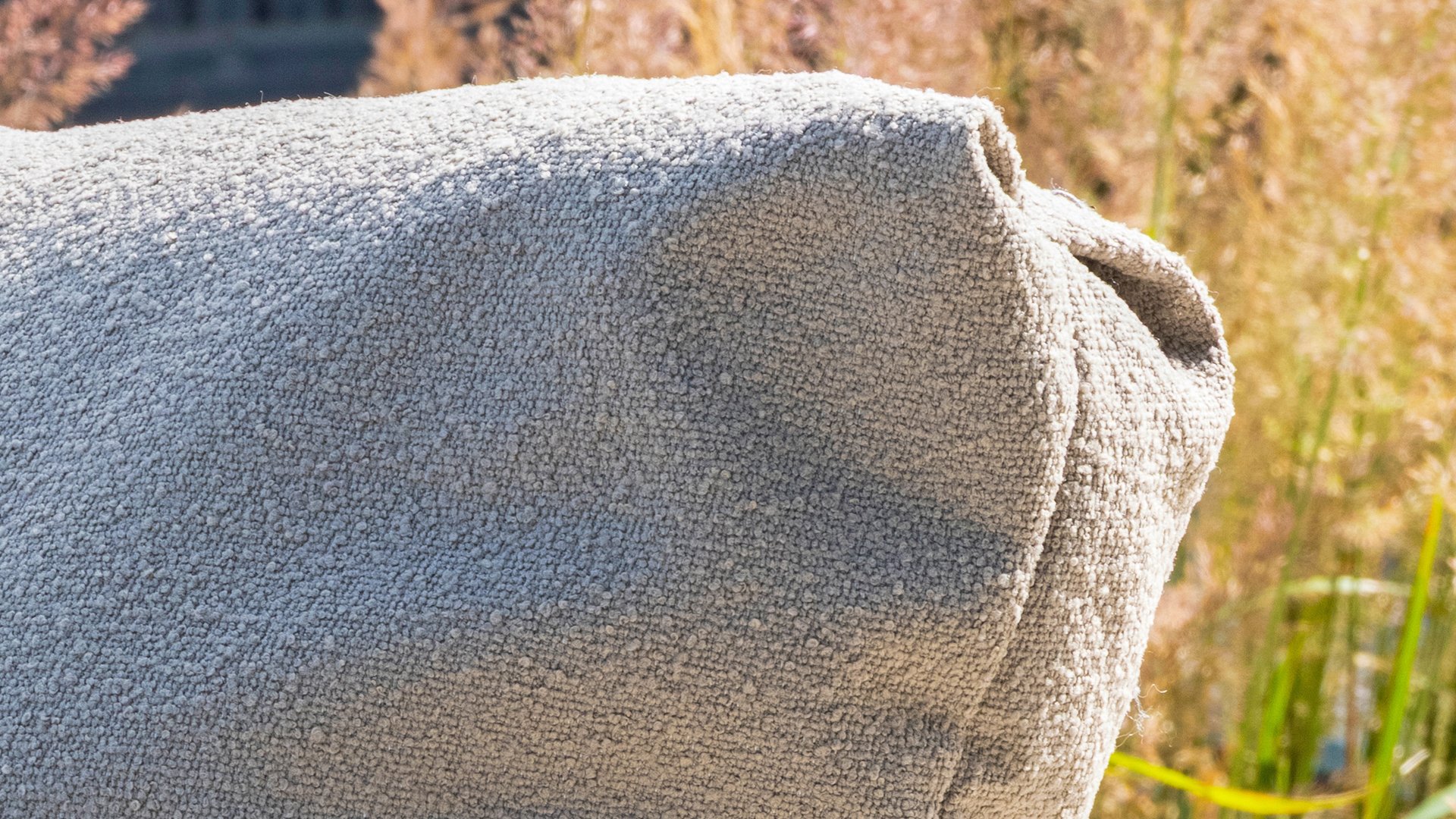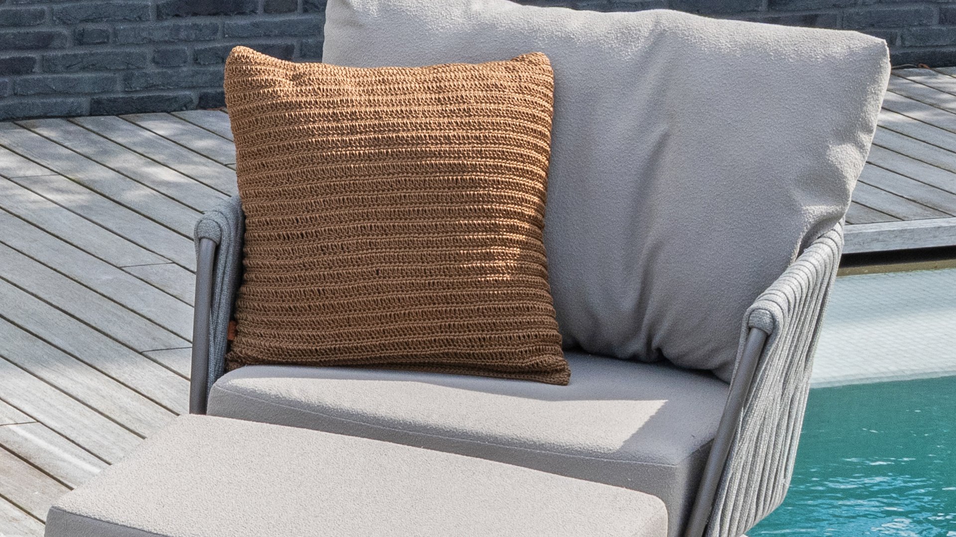 Luxuriöse Optik: Das dicke graue Rope-Gewebe zusammen mit der Terrakotta-Farbe sorgt für einen stilvollen Auftritt. Das Sahnehäubchen sind die Kissen mit Bouclé-Bezug!