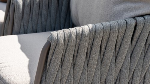 Das Taste Cannes Low Dining-Set vereint Luxus mit entspanntem Outdoor-Wohnkomfort. Es ist lässig, ungezwungen und außergewöhnlich bequem. Im Gegensatz zu herkömmlichen Essgruppen ist es niedriger, sodass Sie in einer angenehmen Lounge-Höhe speisen und eine gemütliche, entspannte Atmosphäre genießen können. Perfekt für lange Abende im Freien, ungezwungene Abendessen oder Drinks mit Freunden und Familie. Der erdfarbene, pulverbeschichtete Aluminiumrahmen bildet einen eleganten Kontrast zum fein gewebten, hellgrauen Seil und verleiht dem Set einen modernen und einladenden Look. Die großzügigen Olefin-Kissen in einem sanften Grau bieten nicht nur höchsten Komfort, sondern sind auch äußerst widerstandsfähig gegen UV-Strahlung und Witterungseinflüsse. Neben diesem Low Dining-Set ist die Taste 4Seasons Cannes Kollektion auch als Esstisch set, Loungeset und High Dining-Set erhältlich, sodass Sie Ihren Außenbereich mit demselben stilvollen Ambiente ausstatten können.