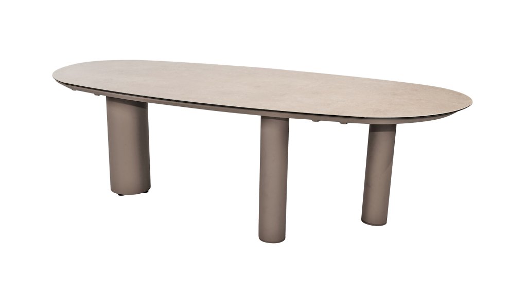 Die markante mangoförmige Tischplatte verleiht dem Denia Tisch eine verspielte, organische Silhouette, die sofort ins Auge fällt. Erhältlich in zwei Farben – Latte und Terre – und zwei Größen – 290 x 110 x 75 cm und 240 x 105 x 75 cm. Die Tischplatte besteht aus Keramik auf Glas, einer robusten und pflegeleichten Kombination, die kratz-, hitze- und fleckenbeständig ist. Das dreibeinige Untergestell aus pulverbeschichtetem Aluminium sorgt für maximale Stabilität und einen modernen Look. Alle Optionen der Tischserie Taste Denia finden Sie unten: