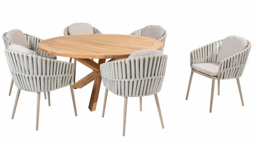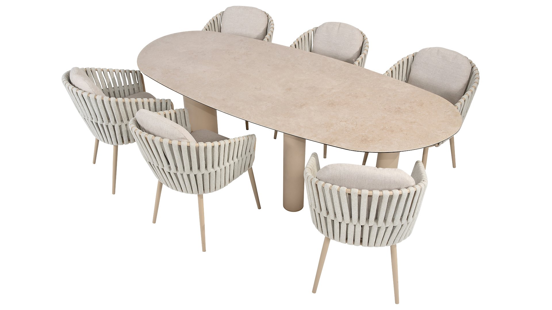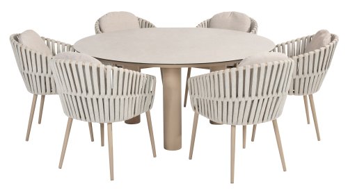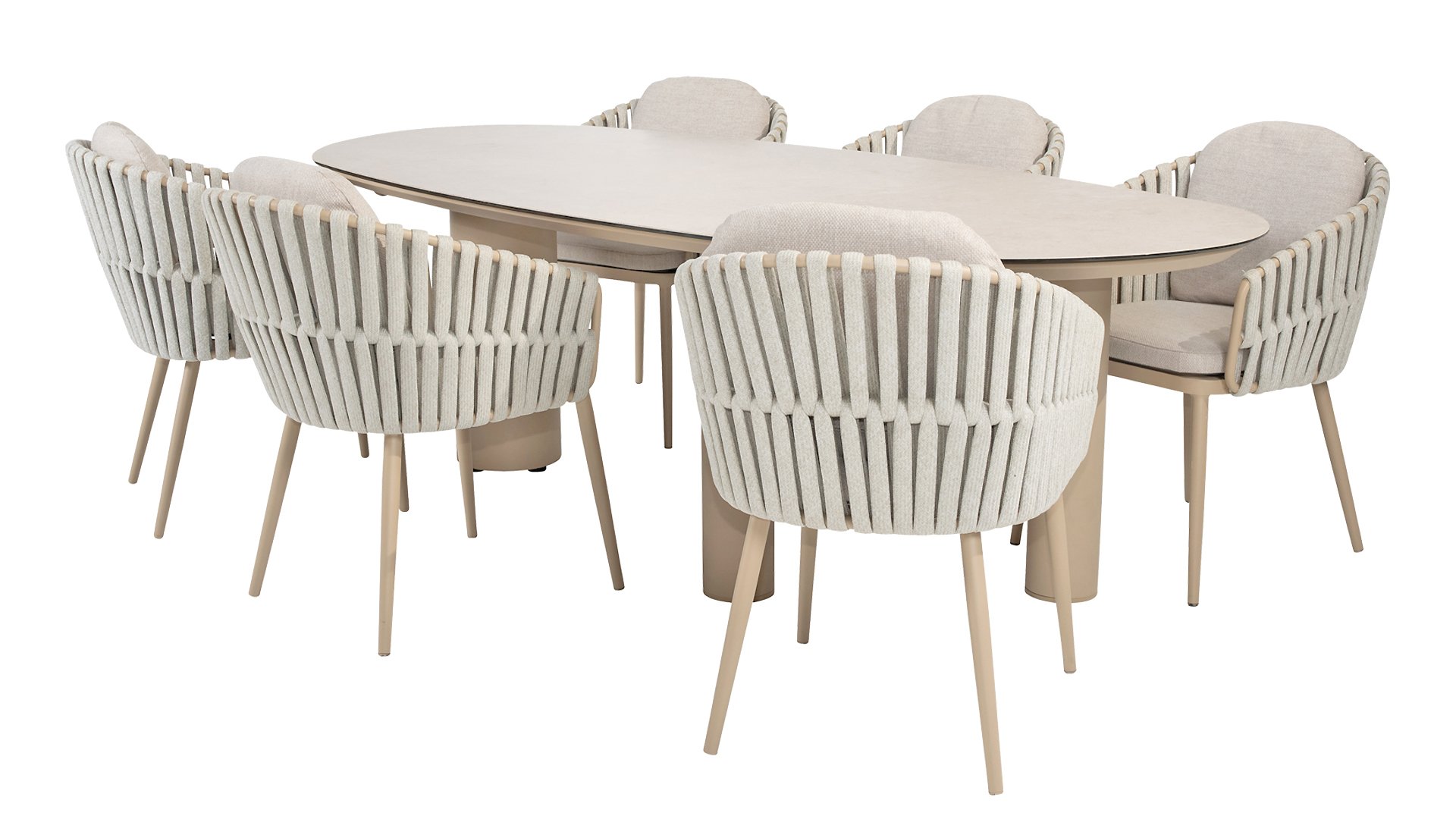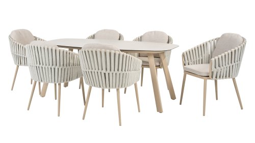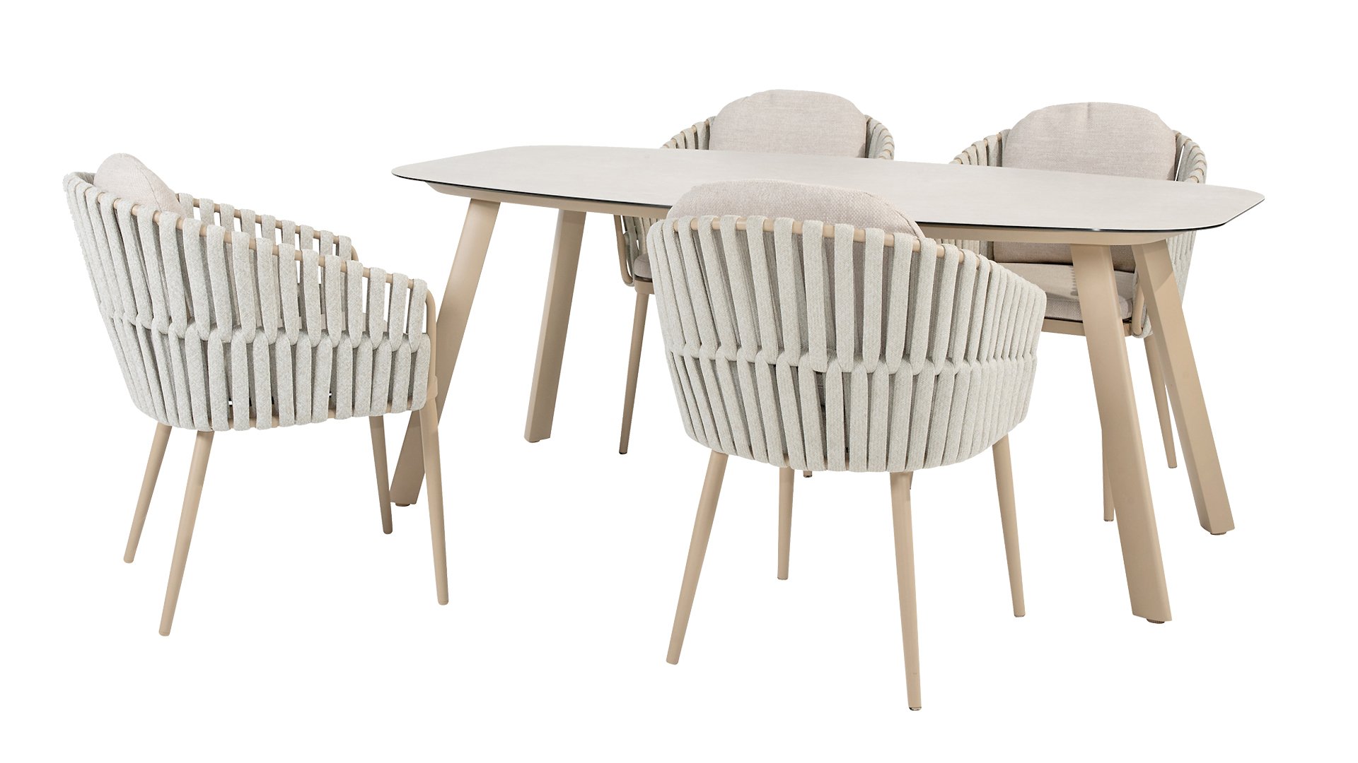 Leidenschaft für Eva Entworfen mit viel Liebe zum Detail. Die dicken, weichen Seilbänder folgen der schönen organischen Form des Rahmens. Fügen Sie dazu noch die wunderbar bequemen Kissen hinzu und Sie verstehen, warum wir vom Taste by 4 Seasons Outdoor Eva Lounge- und Diningset schwärmen. Der Esszimmerstuhl Taste 4SO Eva hat ein modernes Aussehen. Der Stuhl ist mit weichen Kissen ausgestattet und verfügt über ein modernes Aluminiumgestell mit passender Latte-Seilpolsterung. Das dicke Seil harmoniert wunderbar mit dem Lattenrahmen und sorgt zusammen mit den Kissen für bequemes Sitzen. Eine Farbe, die man am besten als geschmackvolles Beige beschreiben kann.