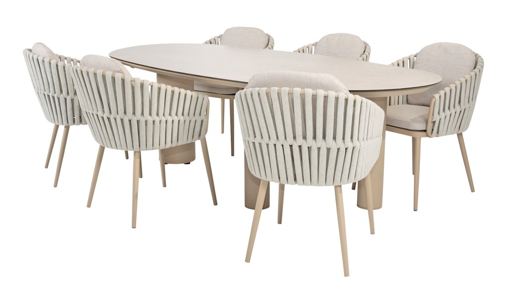 Wir präsentieren die Denia Tischserie von Taste by 4 Seasons Outdoor – stilvolles Essen zu jeder Jahreszeit. Entdecken Sie die perfekte Kombination aus Design, Langlebigkeit und Raffinesse mit der Denia Tischserie. Diese exklusive Serie hebt das Essen im Freien auf ein neues Niveau – mit einzigartigem Design und hochwertigen Materialien, die sowohl funktional als auch elegant sind. Die markante mangoförmige Tischplatte verleiht dem Denia Tisch eine verspielte, organische Silhouette, die sofort ins Auge fällt. Erhältlich in zwei Farben – Latte und Terre – und zwei Größen – 290 x 110 x 75 cm und 240 x 105 x 75 cm. Die Tischplatte besteht aus Keramik auf Glas, einer robusten und pflegeleichten Kombination, die kratz-, hitze- und fleckenbeständig ist. Das dreibeinige Untergestell aus pulverbeschichtetem Aluminium sorgt für maximale Stabilität und einen modernen Look. Alle Optionen der Tischserie Taste Denia finden Sie unten: