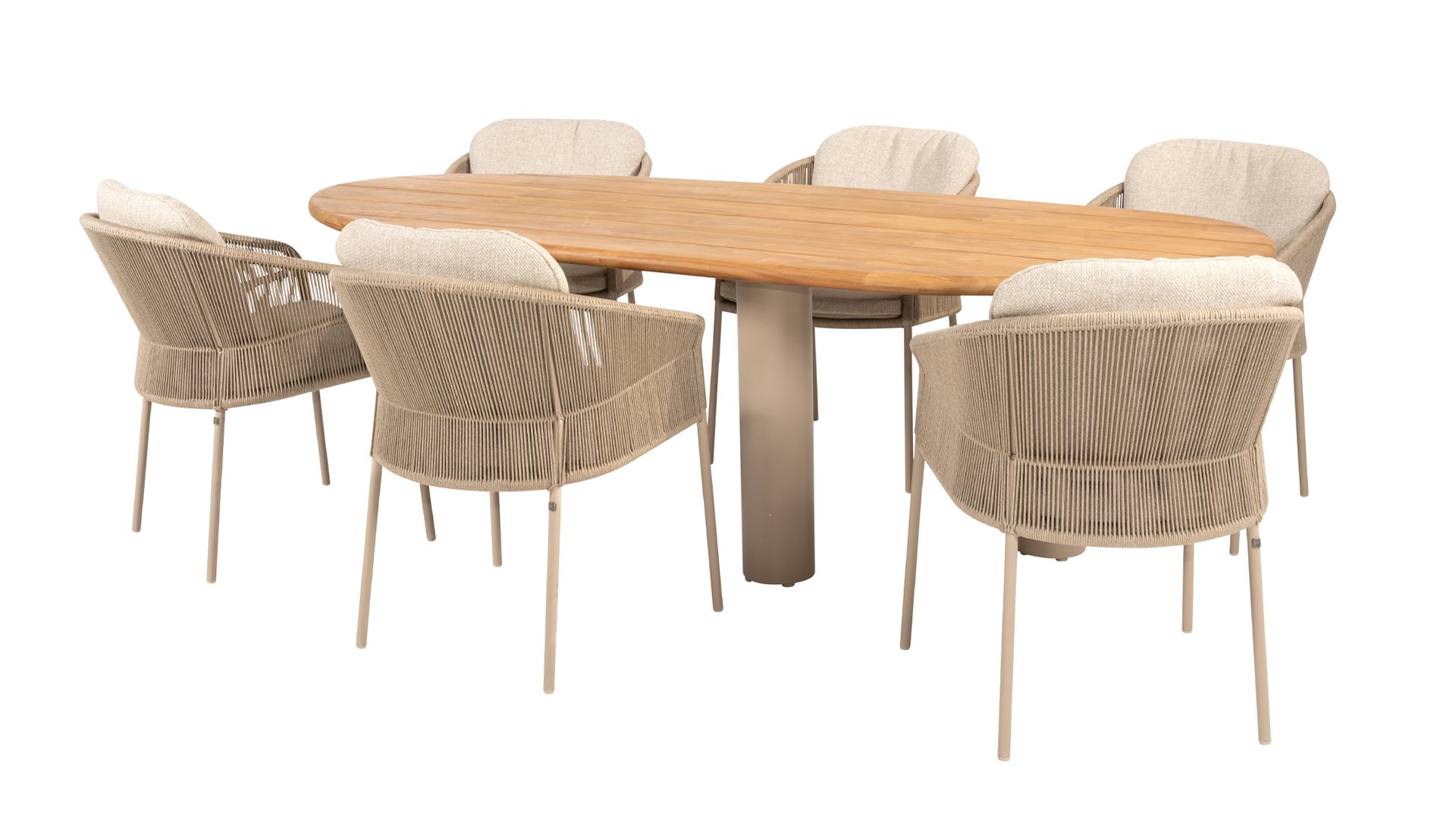 Inspiriert vom zeitlosen Charme Italiens zeichnet sich Florence durch sein dicht gewebtes Seilmuster und die raffinierte Trennung zwischen Rückenlehne und Sitzfläche aus, die einen modernen und eleganten Effekt erzeugen. Die bequemen Kissen bieten hervorragenden Sitzkomfort und machen dieses Esszimmerset perfekt für lange, entspannte Momente im Freien. Erhältlich in zwei eleganten Farben: Taste Florence Dining Terre – ein warmer, erdiger Farbton, der perfekt zu natürlichen Gartenelementen passt. Taste Florence Dining Latte – eine helle, elegante Farbe für einen frischen, sommerlichen Look.