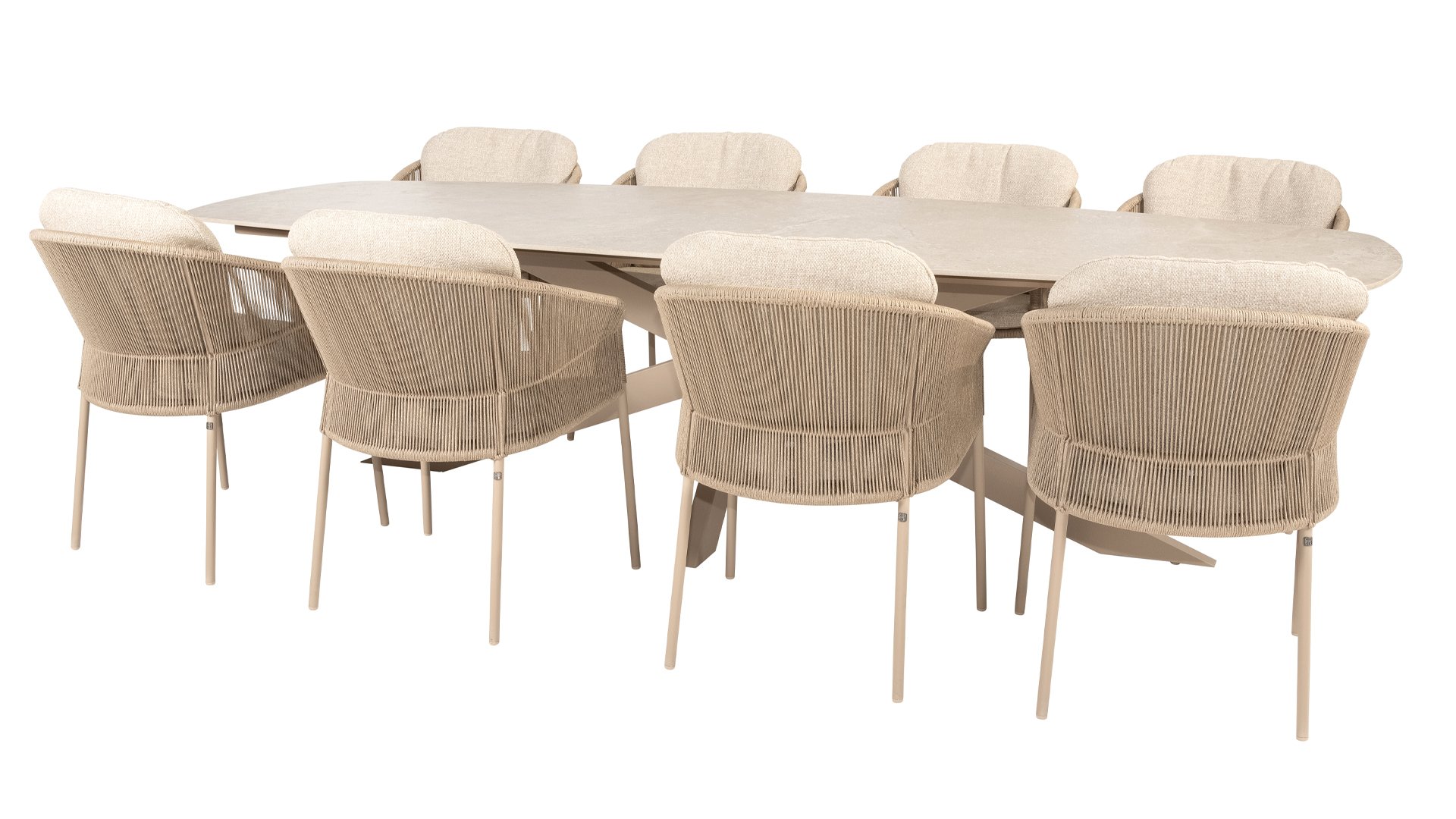 Ein wunderschöner, eleganter Tisch mit einer atemberaubenden ovalen Keramikplatte, erhältlich in 240 cm oder 300 cm. Die Platte strahlt nicht nur Eleganz aus, sondern besticht auch durch ihr markantes, modernes Aussehen. Das markante Kreuzbein ist in drei Farben erhältlich, sodass Sie diesen Tisch mühelos an Ihre Bedürfnisse und Vorlieben anpassen können. Ob Industrieschwarz, warmes Latte oder schickes Terre – jede Farbe verleiht dem Tisch einen einzigartigen Charakter und einen Hauch von Luxus. Mit seinen großzügigen Abmessungen bietet dieser Tisch ausreichend Platz für ein gemütliches Essen mit Freunden oder ein intimes Abendessen mit der Familie. Die Kombination aus raffinierter Keramik und dem starken, stilvollen Bein macht diesen Tisch nicht nur funktional, sondern setzt auch ein atemberaubendes Statement in Ihrem Garten.