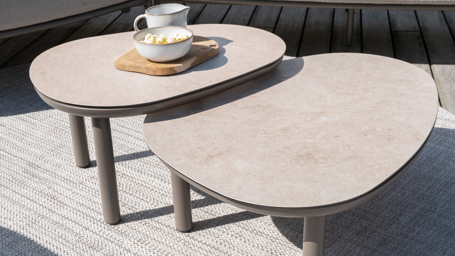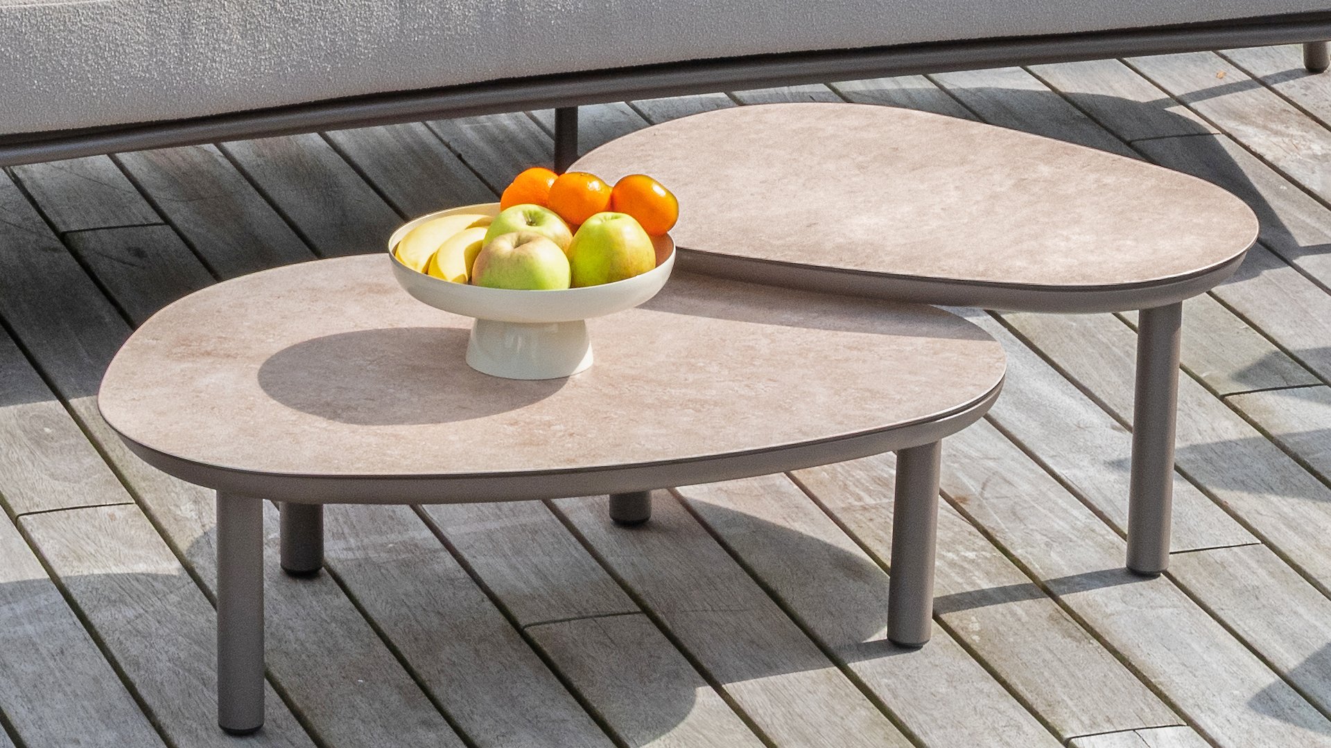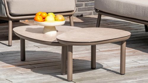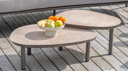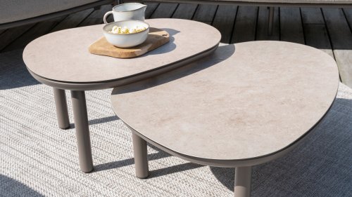 Taste 4Seasons Monroe Verleihen Sie Ihrem Wohnraum einen Hauch von Eleganz und Raffinesse mit der Couchtischserie Monroe von Taste by 4 Seasons Outdoor. Dieses wunderschöne Set besteht aus zwei organisch geformten Tischen mit kieselsteinförmigen Tischplatten – verspielt und doch perfekt ausbalanciert. Dank seines unverwechselbaren Designs wird der Monroe zum stilvollen Blickfang in jedem Innen- und Außenbereich. Die Tischplatten bestehen aus bedruckter Keramik auf Glas und sorgen für eine luxuriöse Optik und eine langlebige, pflegeleichte Oberfläche. Der pulverbeschichtete Aluminiumfuß sorgt für eine stabile Basis und einen modernen, luftigen Look. Das Set ist in zwei Größen erhältlich – Ø65xH32cm und Ø80xH27cm – und lässt sich perfekt kombinieren oder einzeln zu einem dynamischen Ensemble kombinieren. Erhältlich in drei stilvollen Farben – Terre, Latte und Anthrazit – lässt sich der Monroe mühelos in Ihr Interieur oder Ihren Garten integrieren.