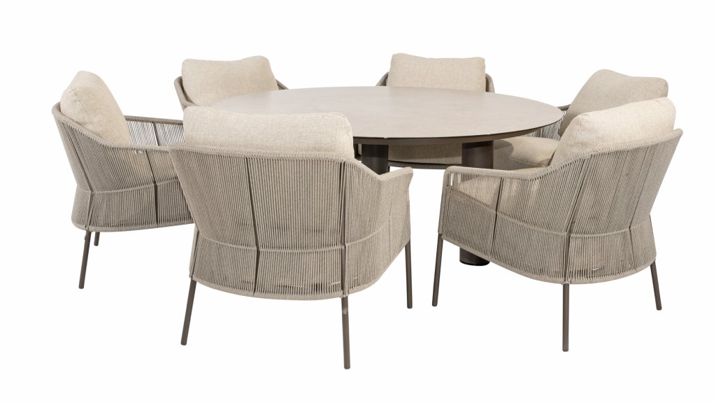 Der Donato Tisch ist mit einem Durchmesser von 160 cm eine tolle Ergänzung für jeden Essbereich und eignet sich ideal für gesellige Runden. Das Besondere an diesem Tisch ist die Gestaltung seiner Beine: Mit insgesamt drei dreieckig angeordneten Beinen bietet er nicht nur Stabilität, sondern auch eine markante, verspielte Optik. Die Keramik-Glas-Tischplatte verleiht ihm eine luxuriöse Ausstrahlung und ist gleichzeitig pflegeleicht. In der Taste by 4 Seasons Outdoor Donato-Serie gibt es einige Möglichkeiten, so ist er als Esstisch in den Farben erhältlich: Taste 4Seasons Donato Tisch Ø160cm Latte & Taste 4Seasons Donato Tisch Ø160 cm Terre, was es Ihnen ermöglicht, das perfekte Match für Ihr Interieur zu wählen. Um die Mayonnaise oder die Milch an die Person gegenüber zu reichen, fügen Sie einfach den: Taste 4Seasons Donato Lazy Susan dem Ganzen hinzu. Außerdem ist auch eine Low-Dining-Variante in der Farben Latte & Terre erhältlich, ideal für ein informelles und entspanntes Speiseerlebnis: Taste 4Seasons Donato Low Dining Tisch Ø160cm Latte, Taste 4Seasons Donato Low-Dining Tisch Ø160 cm Terre. Was gibt es noch?