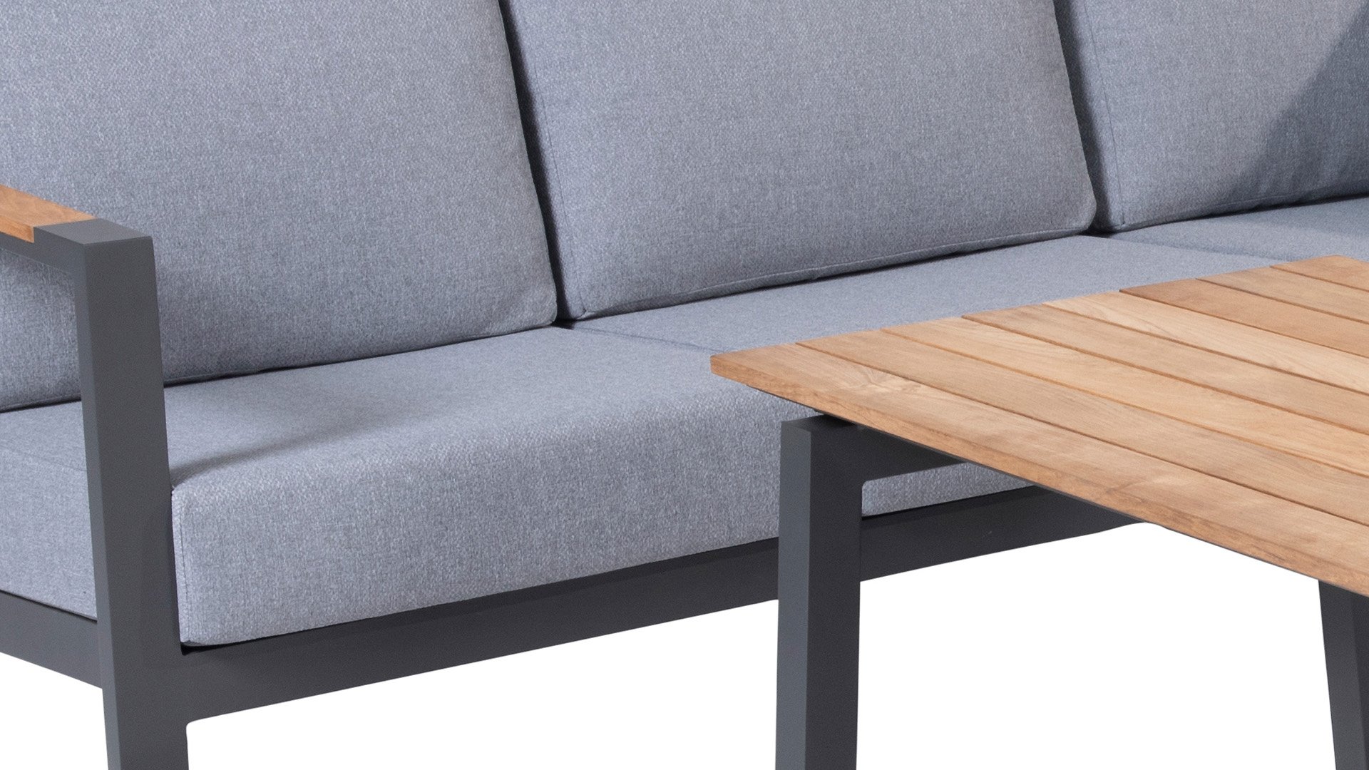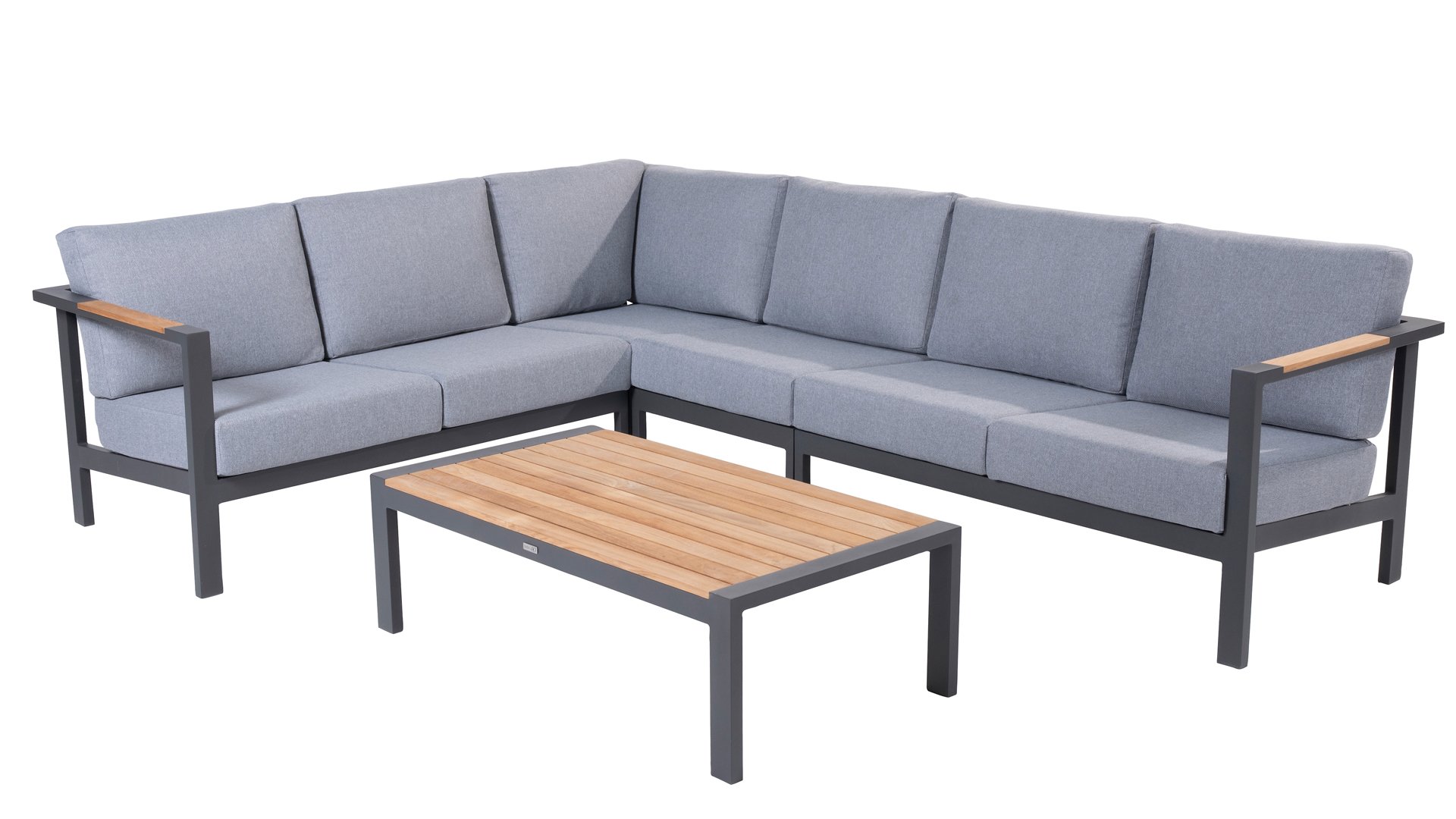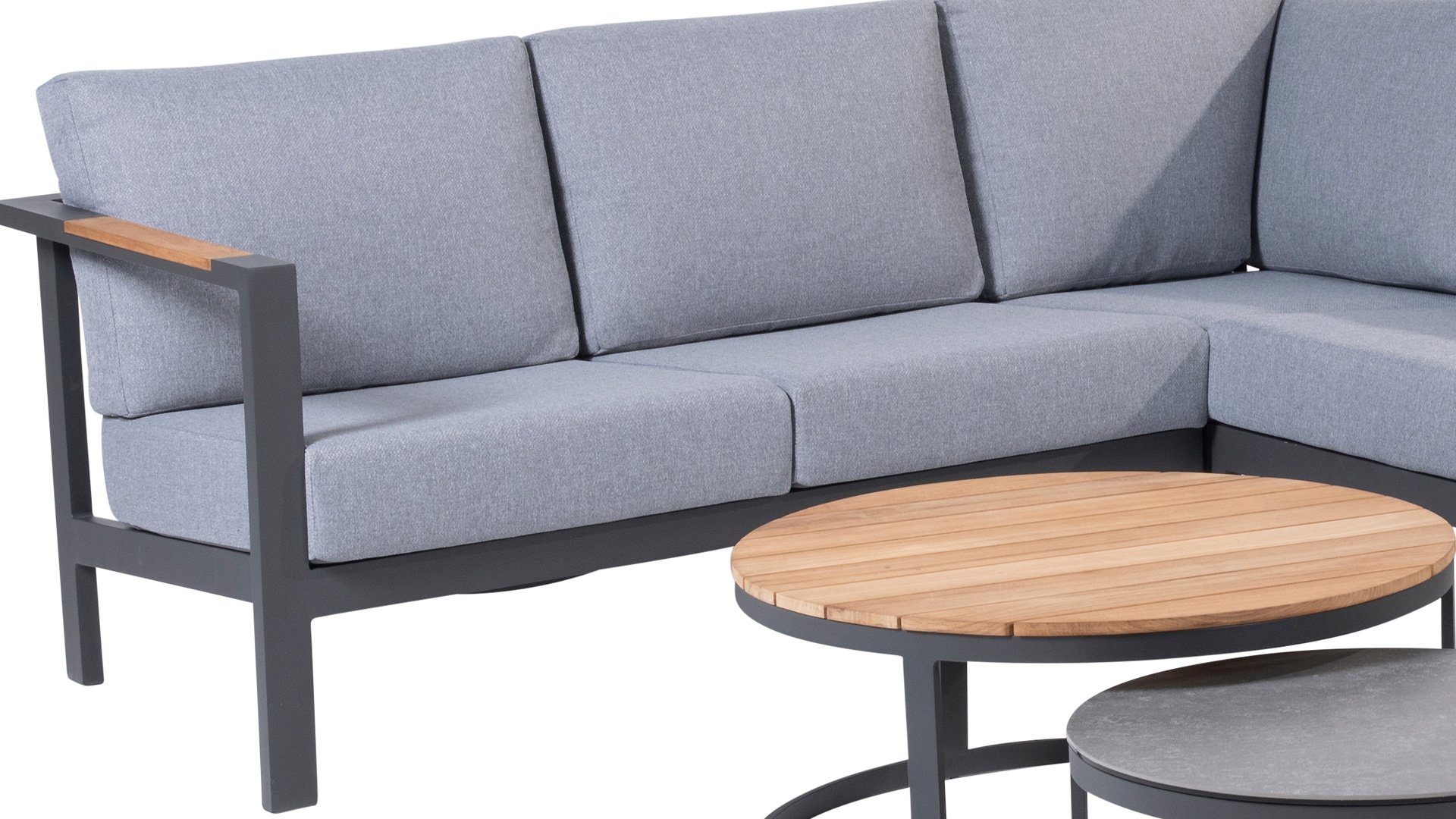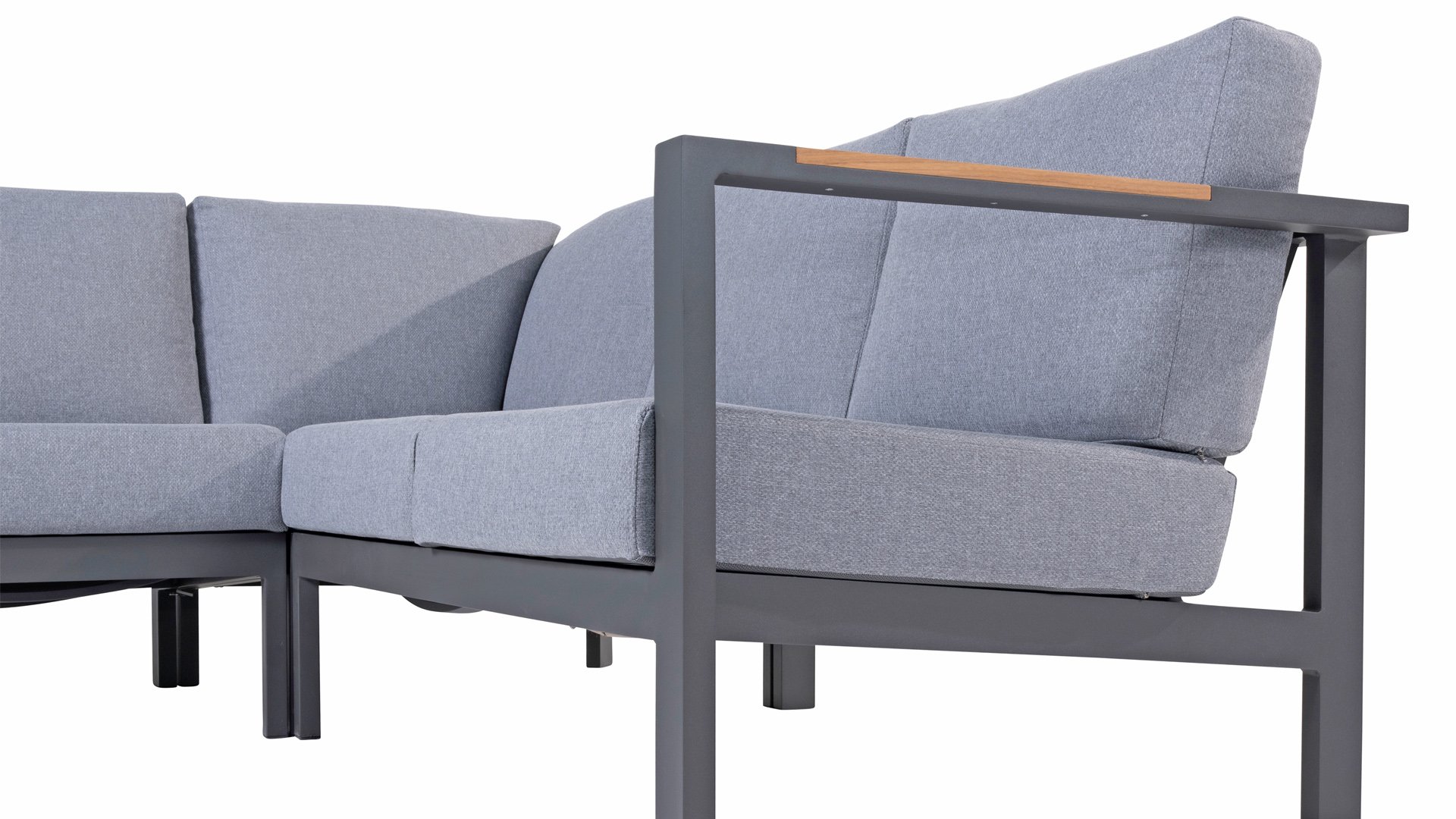 Taste Outdoor Ginger Eck-Loungegruppe ist eine sehr bequeme und robuste gestylten Lounge mit modernem Design. Ein entspanntes Set, um ganz in Ruhe mit einem guten Buch oder der aktuellsten Zeitschrift zu relaxen. Taste Ginger ist in neutralen Farbtönen ausgeführt und passt daher in fast jedem Garten. Der Rahmen ist aus hochwertigem Anthrazit pulverbeschichtetem Aluminium und abgefertigt mit wetterfest Teak Holzerner Armlehnen. Die hell graue Kissen sind extra dick und einladend. Der Stoff ist wetterbeständig und hat ein robustes Aussehen. Unter den Sitzkissen befindet sich eine Textileen-Bespannung zur Erhöhung des Sitzkomforts.
