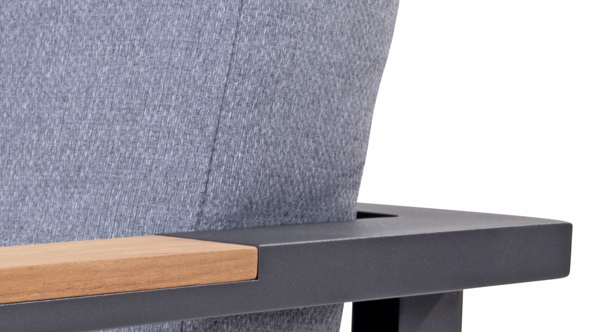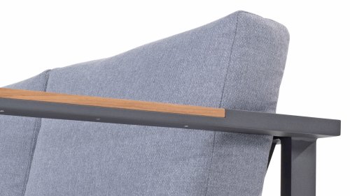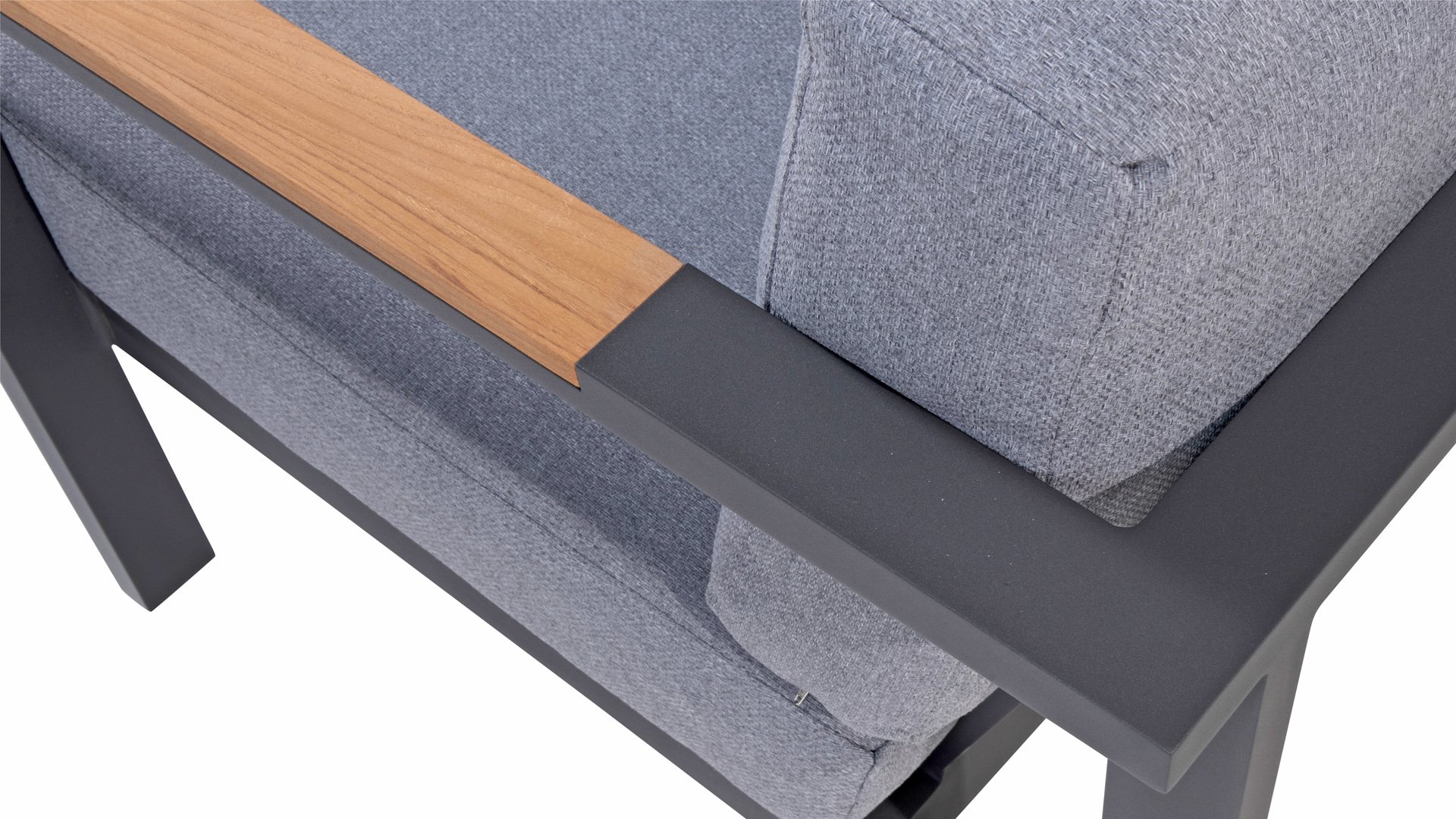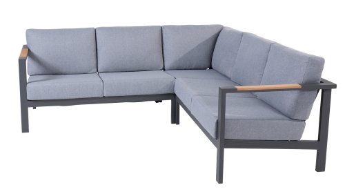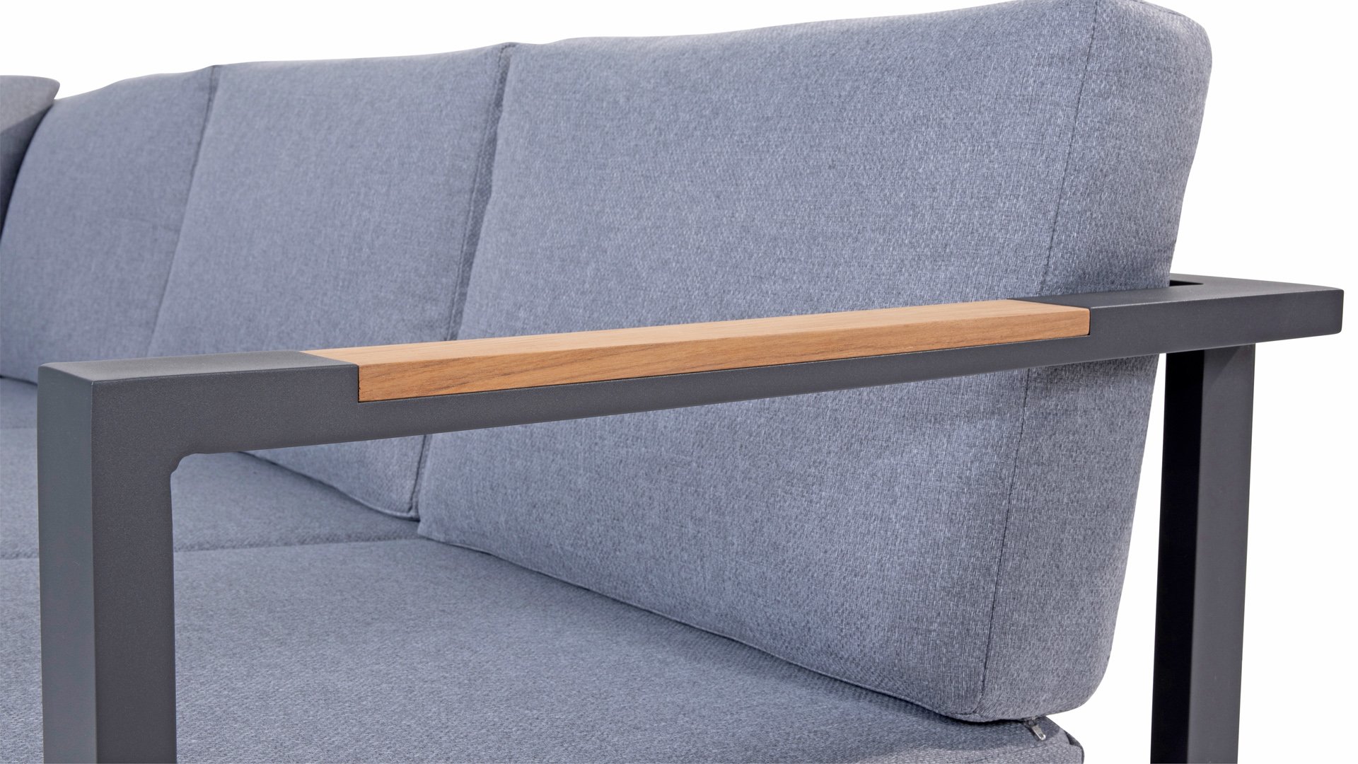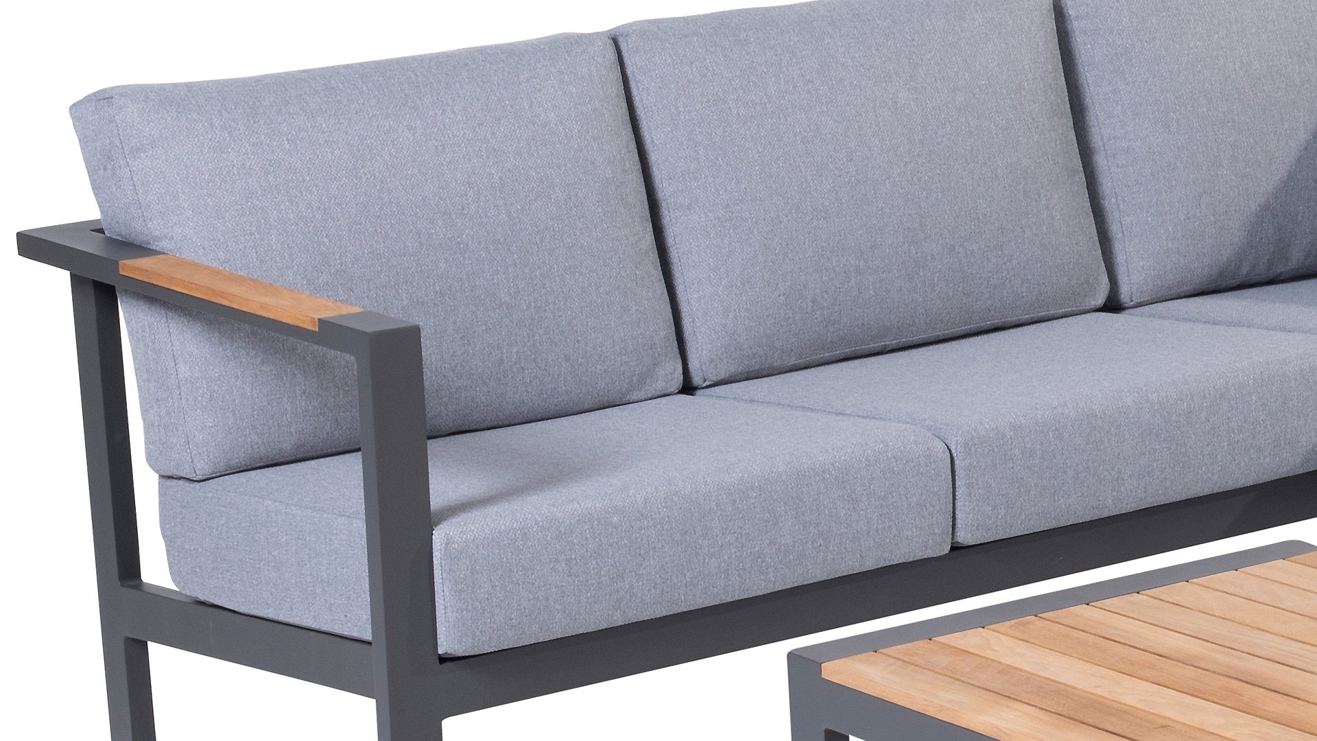 Taste Outdoor Ginger Eck-Loungegruppe ist eine sehr bequeme und robuste gestylten Lounge mit modernem Design. Ein entspanntes Set, um ganz in Ruhe mit einem guten Buch oder der aktuellsten Zeitschrift zu relaxen. Taste Ginger ist in neutralen Farbtönen ausgeführt und passt daher in fast jedem Garten. Der Rahmen ist aus hochwertigem Anthrazit pulverbeschichtetem Aluminium und abgefertigt mit wetterfest Teak Holzerner Armlehnen. Die hell graue Kissen sind extra dick und einladend. Der Stoff ist wetterbeständig und hat ein robustes Aussehen. Unter den Sitzkissen befindet sich eine Textileen-Bespannung zur Erhöhung des Sitzkomforts.