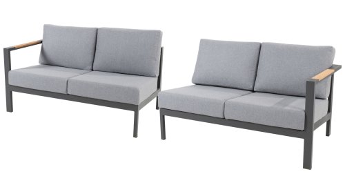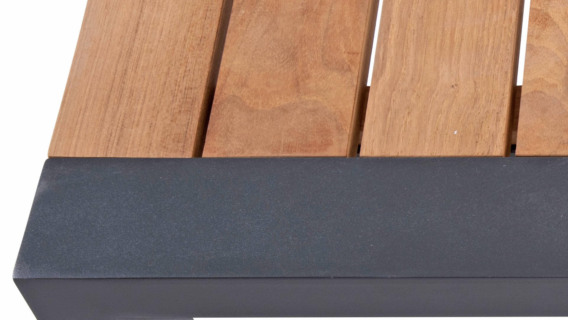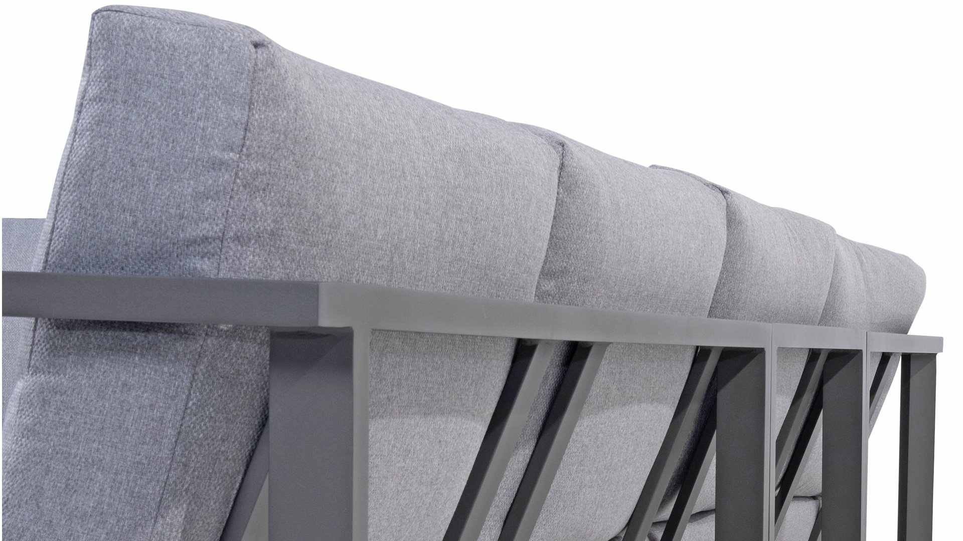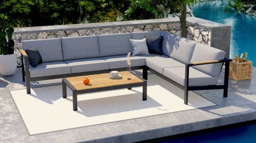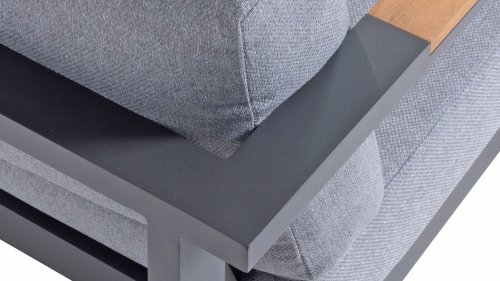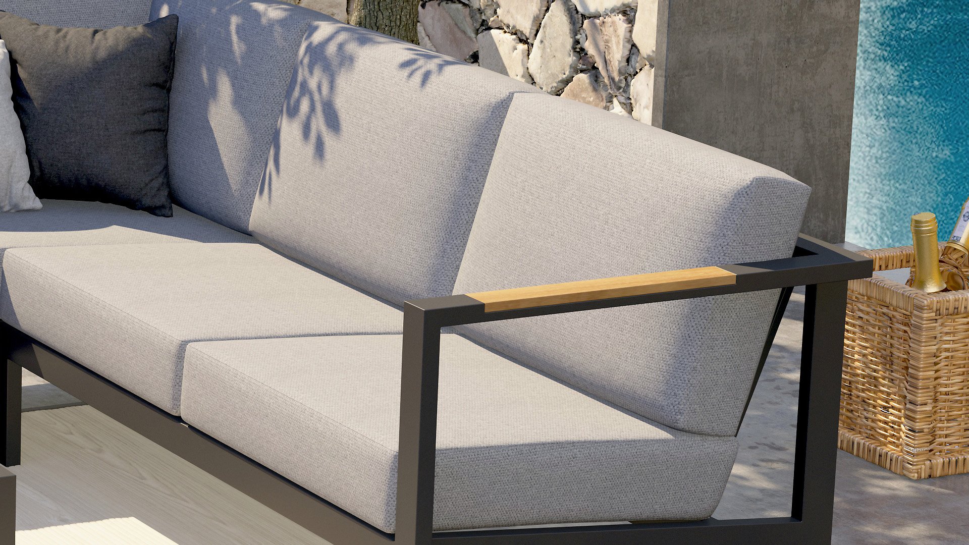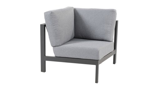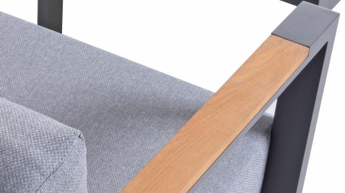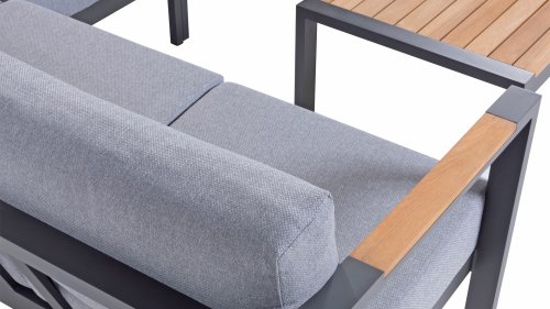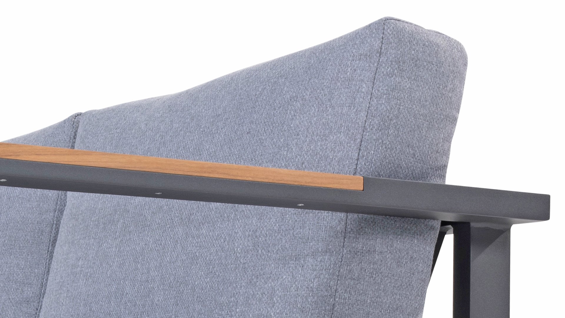 Taste Outdoor Ginger Eck-Loungegruppe ist eine sehr bequeme und robuste gestylten Lounge mit modernem Design. Ein entspanntes Set, um ganz in Ruhe mit einem guten Buch oder der aktuellsten Zeitschrift zu relaxen. Taste Ginger ist in neutralen Farbtönen ausgeführt und passt daher in fast jedem Garten. Der Rahmen ist aus hochwertigem Anthrazit pulverbeschichtetem Aluminium und abgefertigt mit wetterfest Teak Holzerner Armlehnen. Die hell graue Kissen sind extra dick und einladend. Der Stoff ist wetterbeständig und hat ein robustes Aussehen. Unter den Sitzkissen befindet sich eine Textileen-Bespannung zur Erhöhung des Sitzkomforts.
