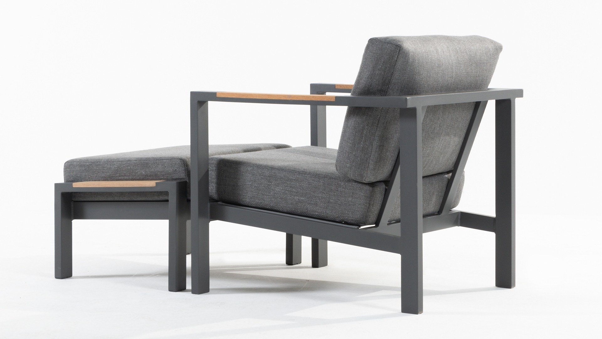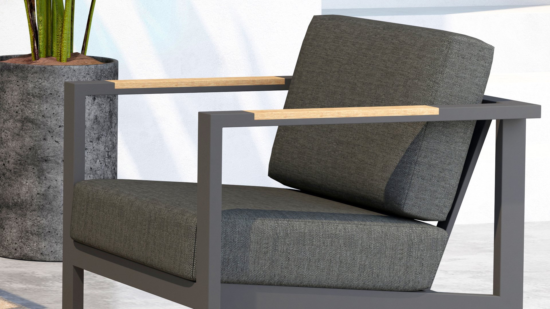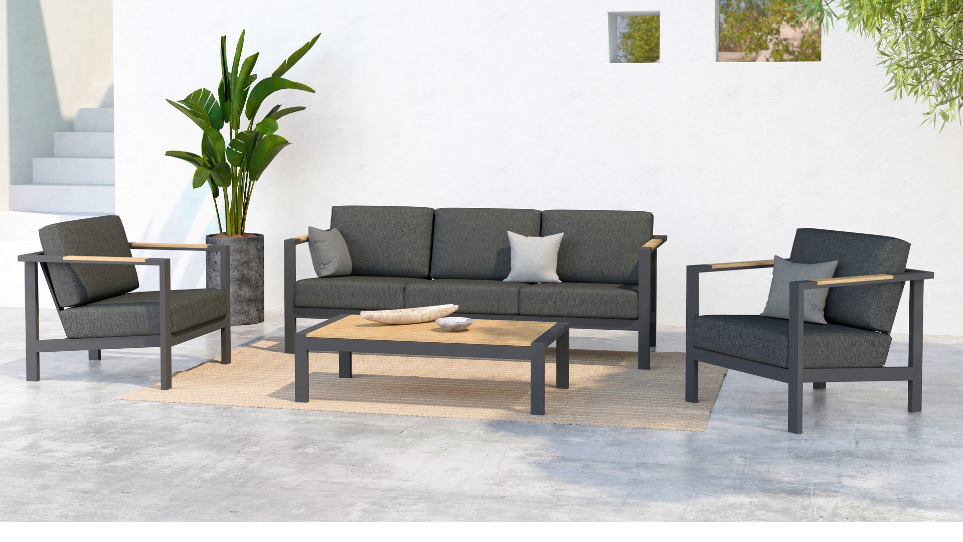 Taste Outdoor Ginger Loungegruppe ist eine sehr bequeme und robuste gestylten Lounge mit modernem Design. Ein entspanntes Set, um ganz in Ruhe mit einem guten Buch oder der aktuellsten Zeitschrift zu relaxen. Taste Ginger ist in neutralen Farbtönen ausgeführt und passt daher in fast jedem Garten. Der Rahmen ist aus hochwertigem Anthrazit pulverbeschichtetem Aluminium und abgefertigt mit wetterfest Teak Holzerner Armlehnen. Die graue Kissen sind extra dick und einladend. Der Stoff ist wetterbeständig und hat ein robustes Aussehen. Unter den Sitzkissen befindet sich eine Textileen-Bespannung zur Erhöhung des Sitzkomforts.