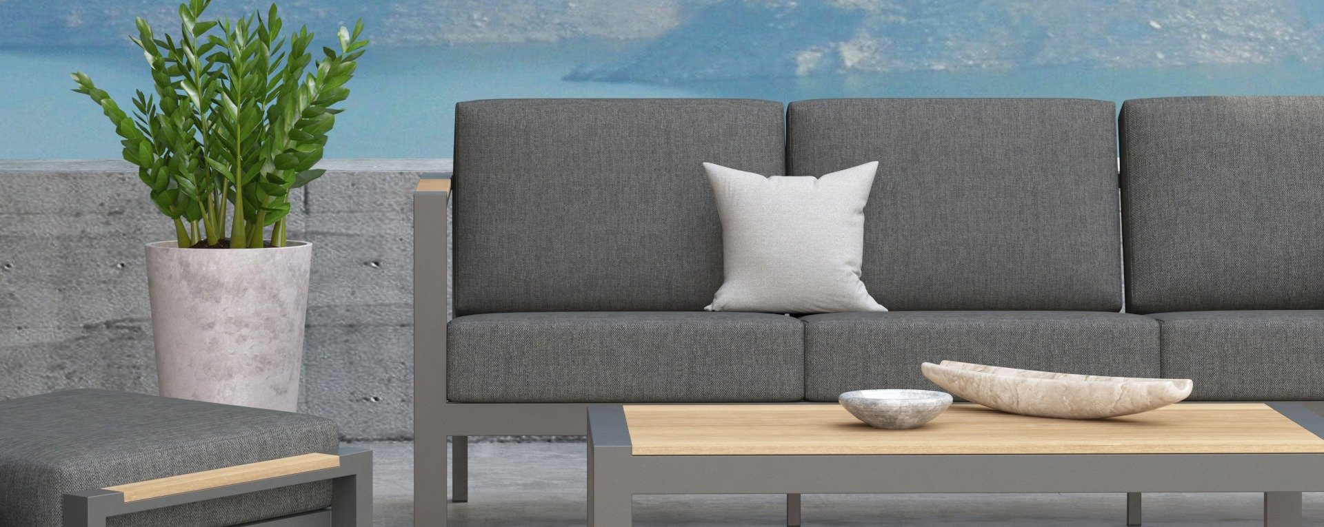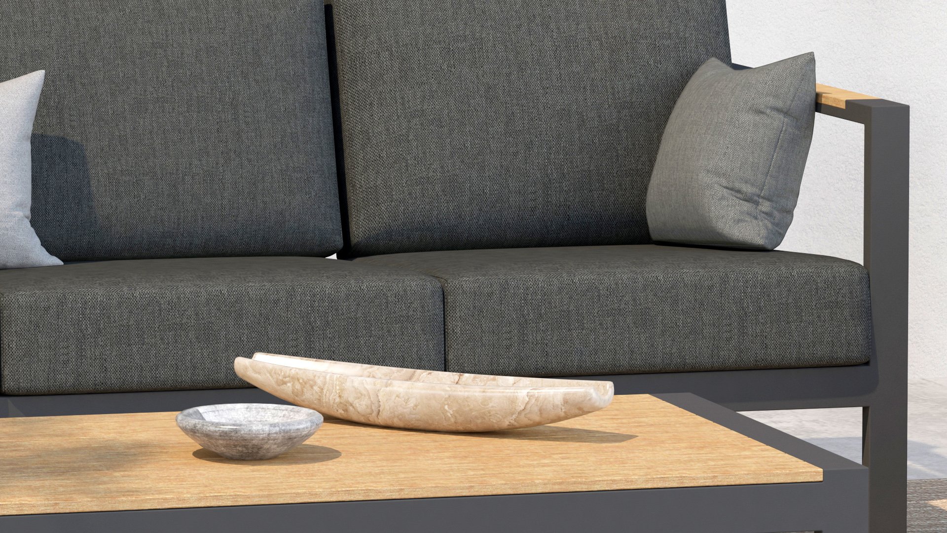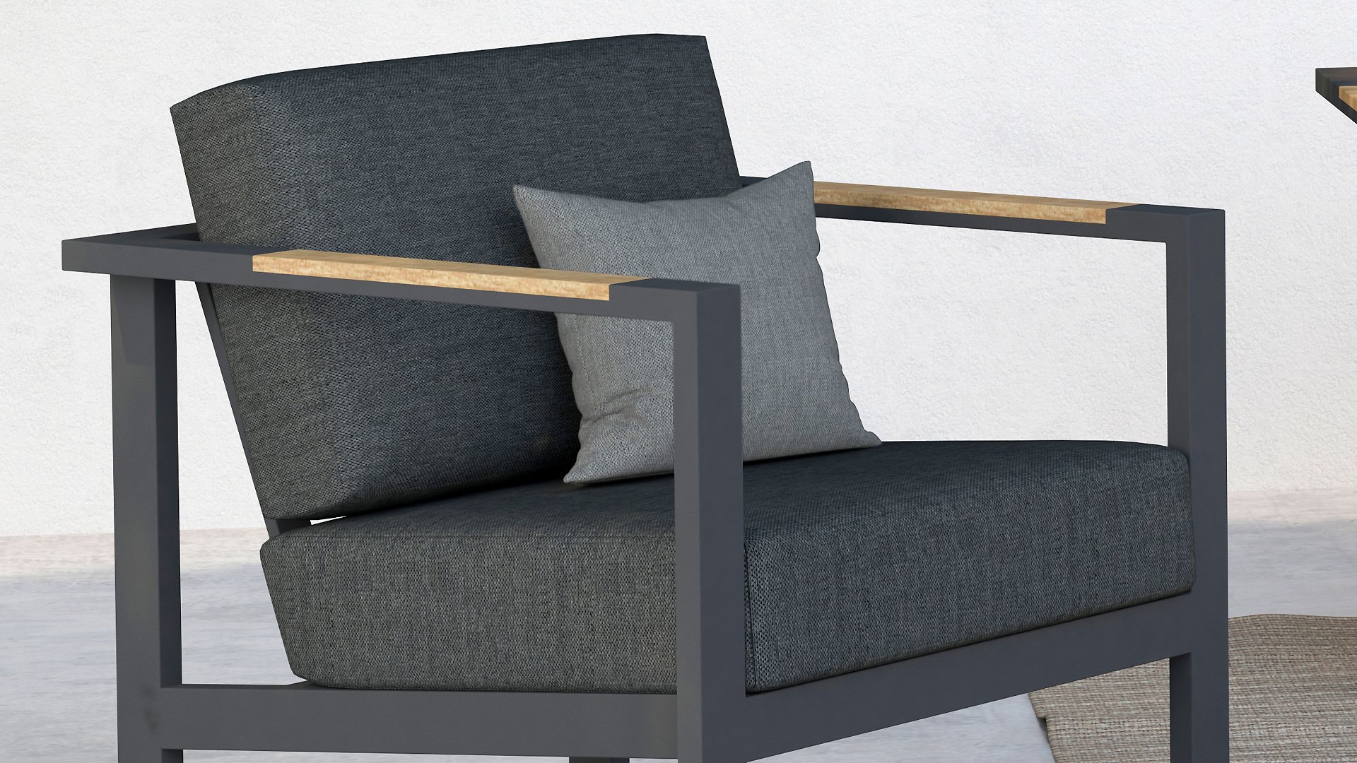 Taste Outdoor Ginger Loungegruppe ist eine sehr bequeme und robuste gestylten Lounge mit modernem Design. Ein entspanntes Set, um ganz in Ruhe mit einem guten Buch oder der aktuellsten Zeitschrift zu relaxen. Taste Ginger ist in neutralen Farbtönen ausgeführt und passt daher in fast jedem Garten. Der Rahmen ist aus hochwertigem Anthrazit pulverbeschichtetem Aluminium und abgefertigt mit wetterfest Teak Holzerner Armlehnen. Die graue Kissen sind extra dick und einladend. Der Stoff ist wetterbeständig und hat ein robustes Aussehen. Unter den Sitzkissen befindet sich eine Textileen-Bespannung zur Erhöhung des Sitzkomforts.