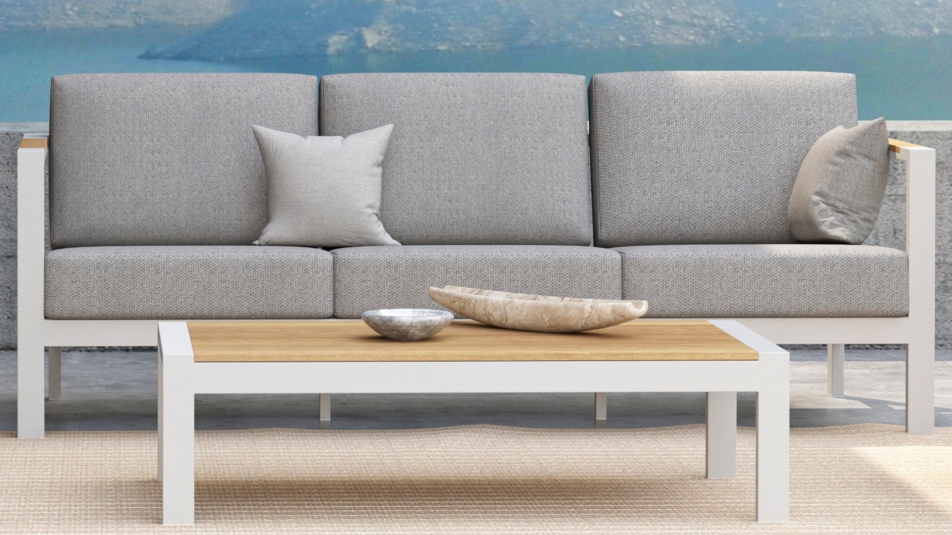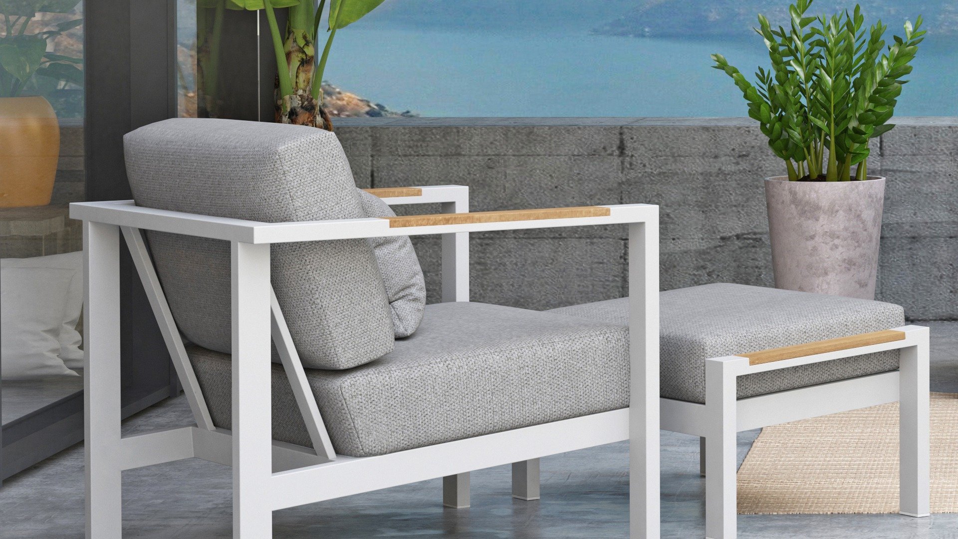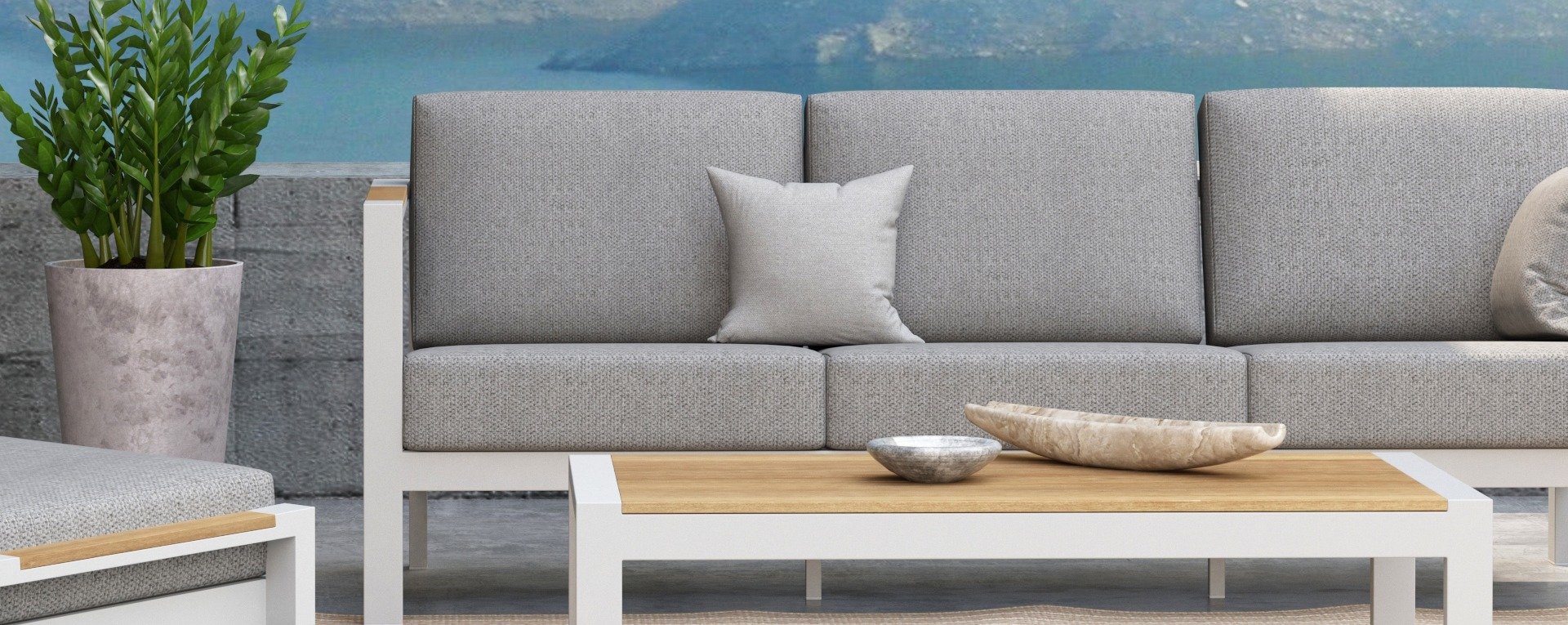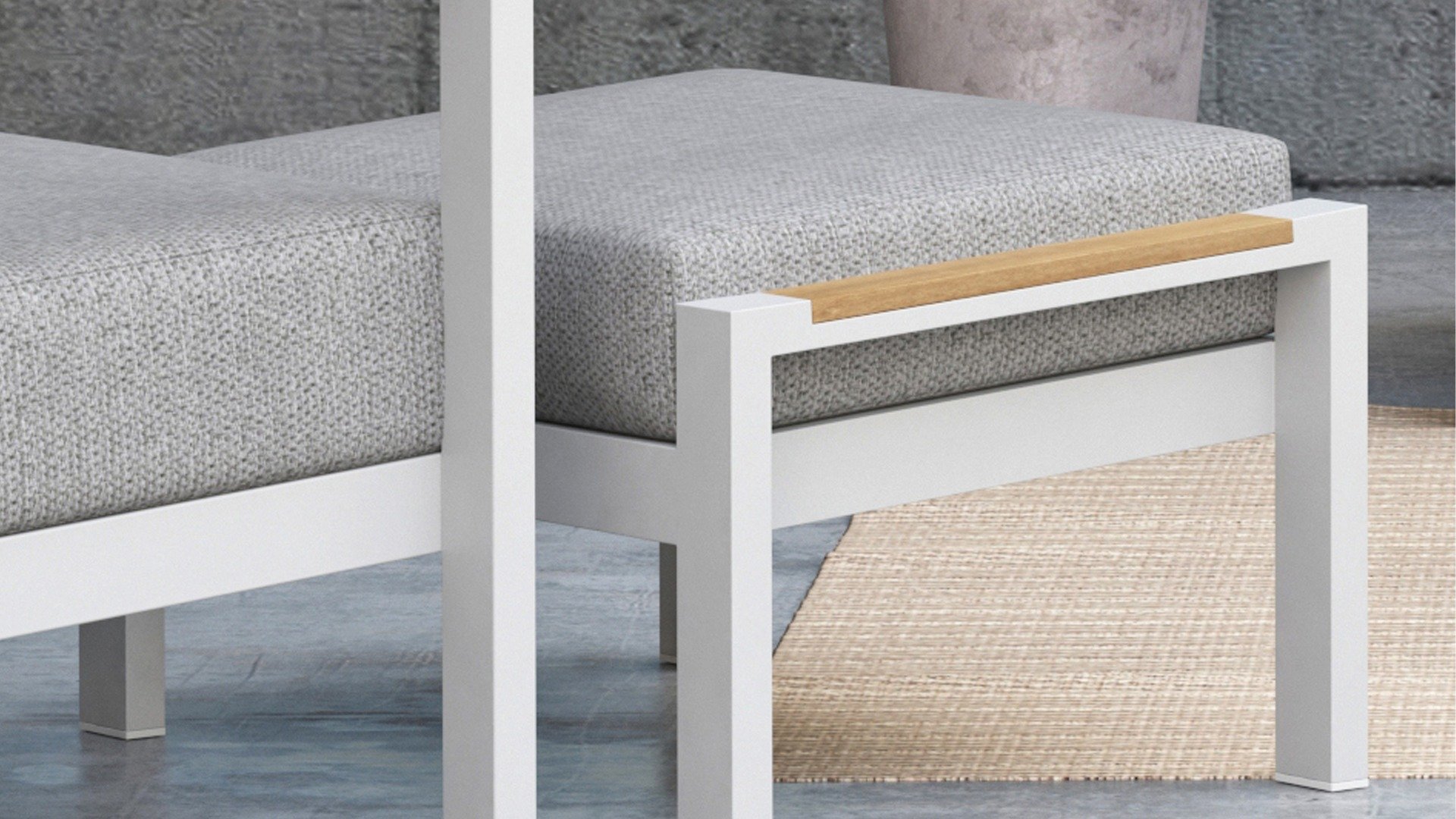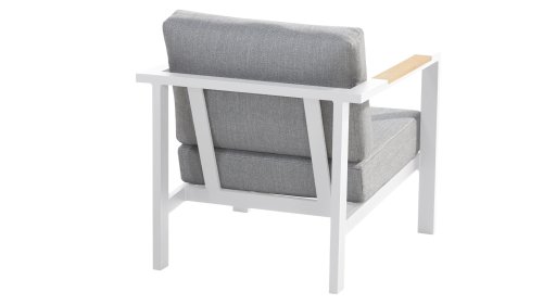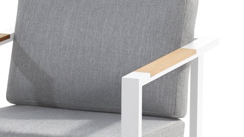 Taste Outdoor Ginger Loungegruppe ist eine sehr bequeme und robuste gestylten Lounge mit modernem Design. Ein entspanntes Set, um ganz in Ruhe mit einem guten Buch oder der aktuellsten Zeitschrift zu relaxen. Taste Ginger ist in neutralen Farbtönen ausgeführt und passt daher in fast jedem Garten. Der Rahmen ist aus hochwertigem White pulverbeschichtetem Aluminium und abgefertigt mit wetterfest Teak Holzerner Armlehnen. Die graue Kissen sind extra dick und einladend. Der Stoff ist wetterbeständig und hat ein robustes Aussehen. Unter den Sitzkissen befindet sich eine Textileen-Bespannung zur Erhöhung des Sitzkomforts.