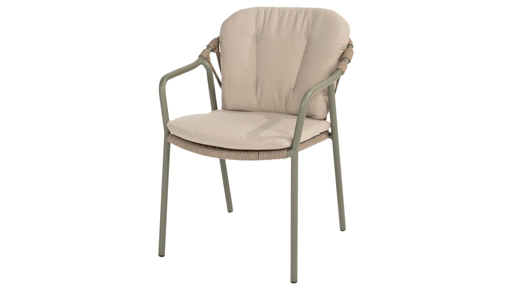 Dieser Stuhl ist in drei Farben erhältlich, nämlich: Latte, (Olive) und Antraciet. Der Stuhl ist mit bequemen Kissen aus Olefin-Stoff ausgestattet, einem wetterbeständigen Material, das sich weich anfühlt und schnell trocknet. Das bedeutet, dass Sie nicht nur den Komfort des Stuhls genießen können, sondern auch die einfache Pflege. Die Kissen werden standardmäßig mitgeliefert, sodass Sie sofort den ultimativen Sitzkomfort genießen können.