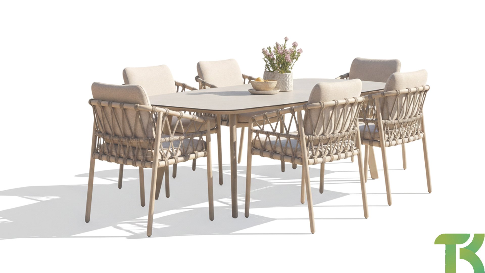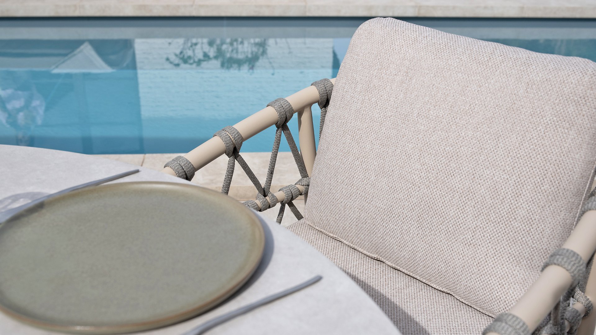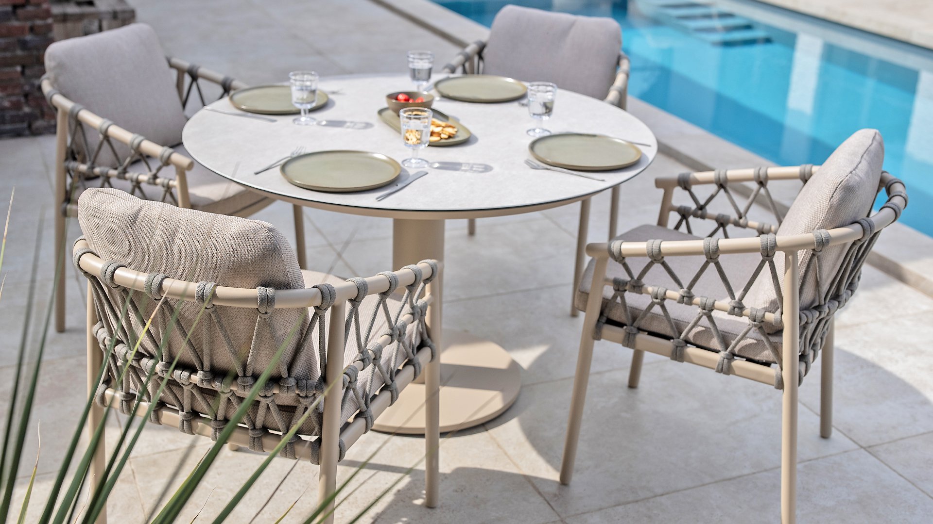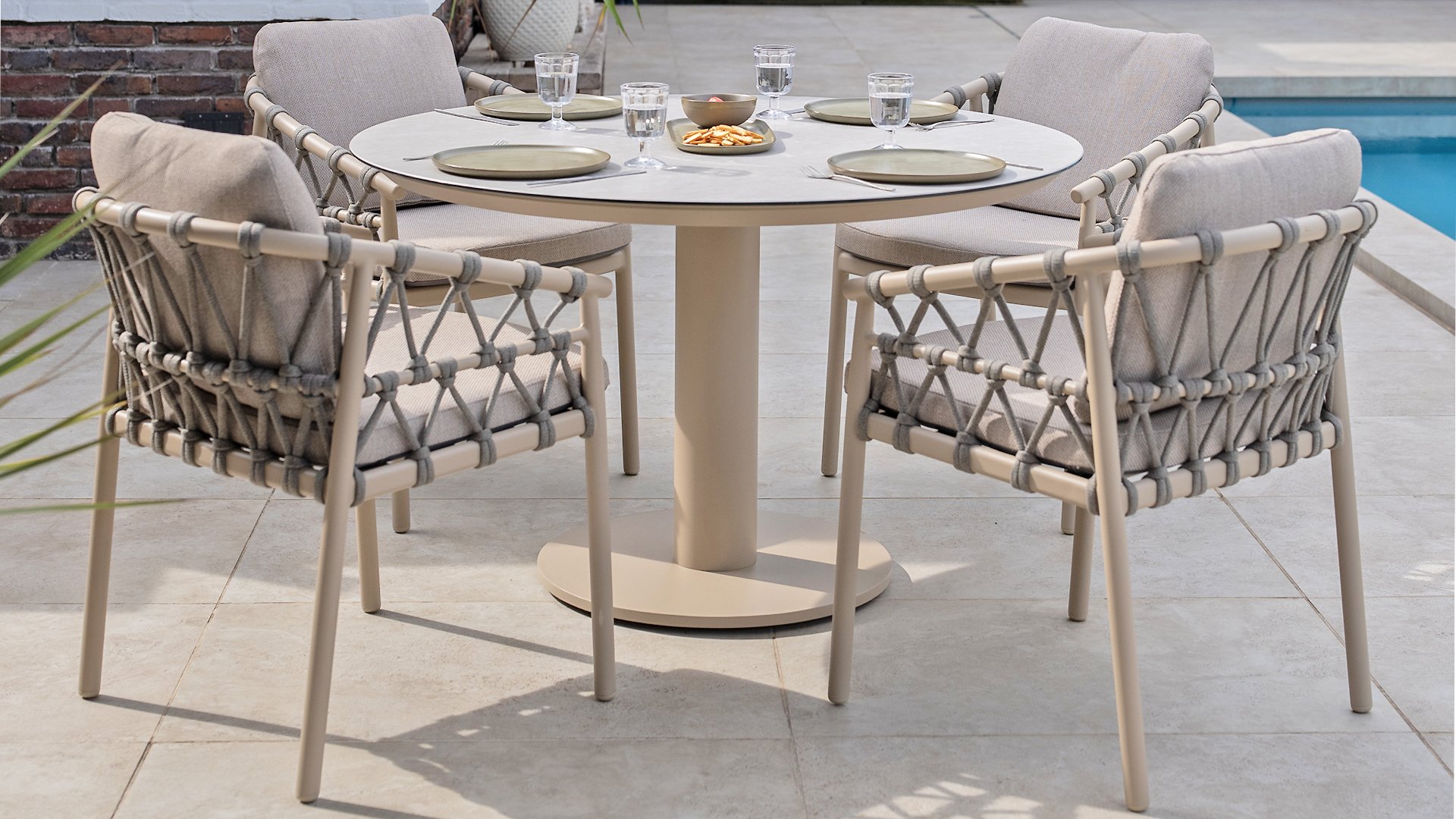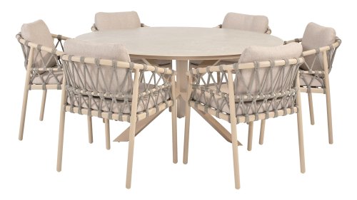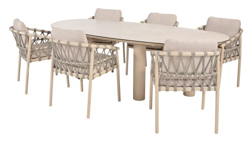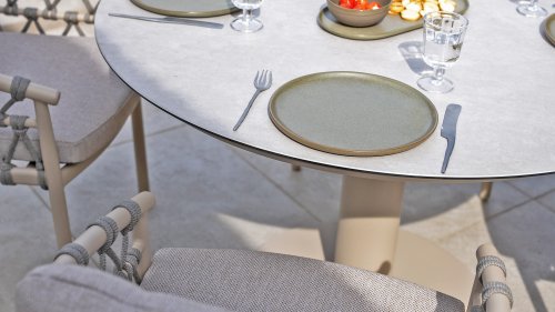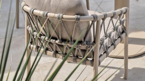 Das Besondere am Piacenza ist seine schöne, sanfte Farbe. Das pulverbeschichtete Aluminiumgestell ist in Latte gehalten. Dieser warme, sandige Farbton wirkt viel weicher und natürlicher als herkömmliches Weiß oder Anthrazit. Das Gestell ist mit edlem, grauem Seilgarn bezogen. Dieses Seil ist luftig gewebt und verleiht dem Sessel eine großzügige und verspielte Optik. Die bequeme Sitzfläche wird durch hellgraue Olefin-Kissen ergänzt. Dieser Stoff fühlt sich weich an wie ein Indoor-Stoff, ist aber wetterfest, windbeständig und UV-beständig.