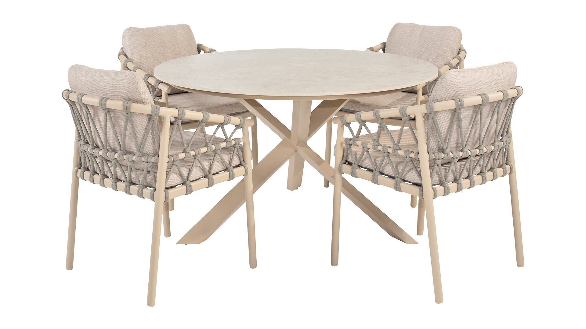Ein Hauch von "La Dolce Vita“ für Ihren Garten. Die Taste Piacenza besticht durch ihre wunderschöne, sanfte Farbe. Das pulverbeschichtete Aluminiumgestell ist in Latte gehalten. Dieser warme, sandige Farbton wirkt viel weicher und natürlicher als herkömmliches Weiß oder Anthrazit. Das Gestell ist mit edlem, grauem Seilgarn bezogen. Dieses luftig gewebte Garn verleiht dem Stuhl ein großzügiges Erscheinungsbild und einen verspielten Charakter. Die bequeme Sitzfläche wird durch hellgraue Olefin-Kissen ergänzt. Dieser Stoff fühlt sich weich an wie ein Indoor-Stoff und ist gleichzeitig wetterfest, windbeständig und UV-beständig.