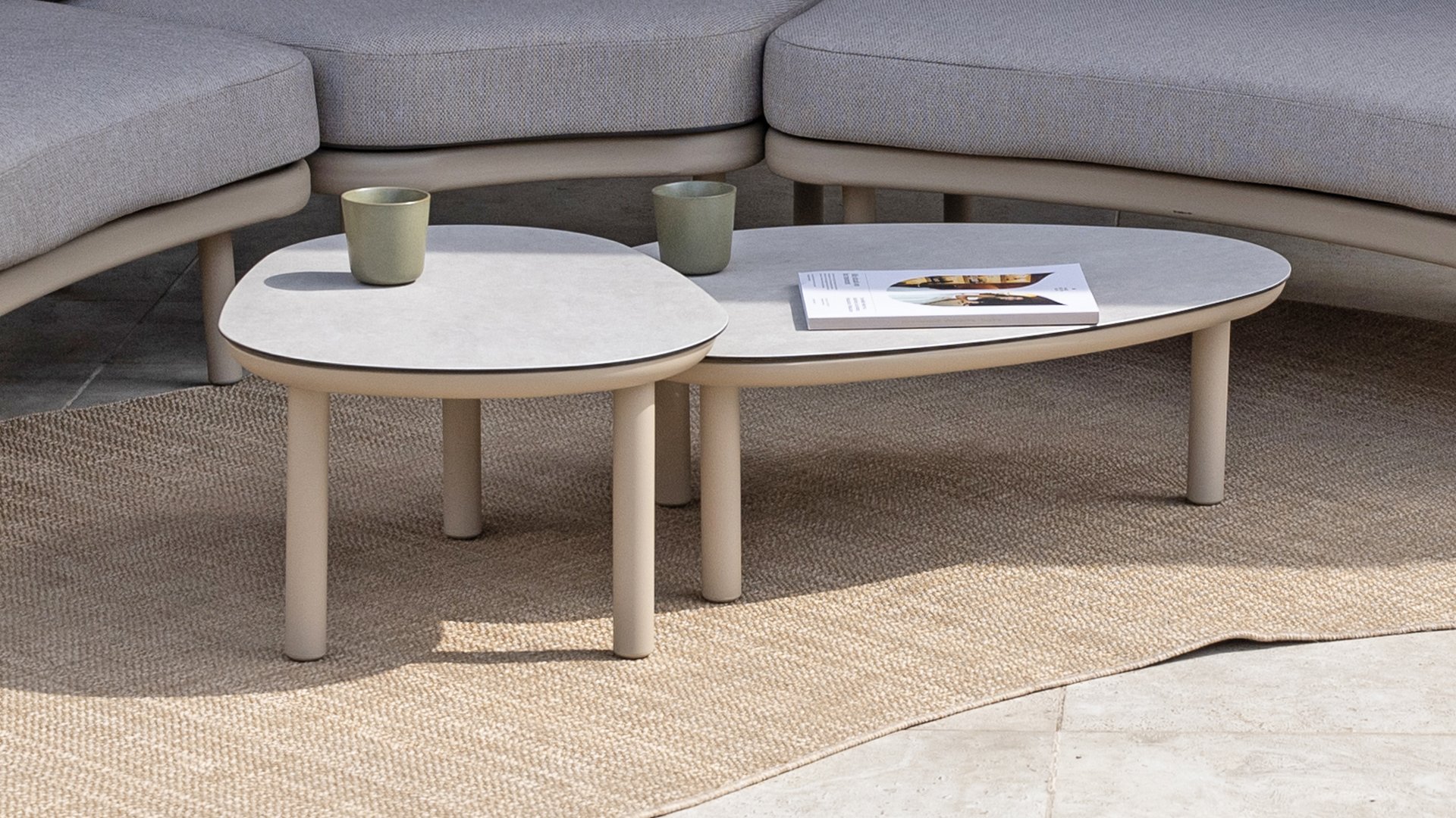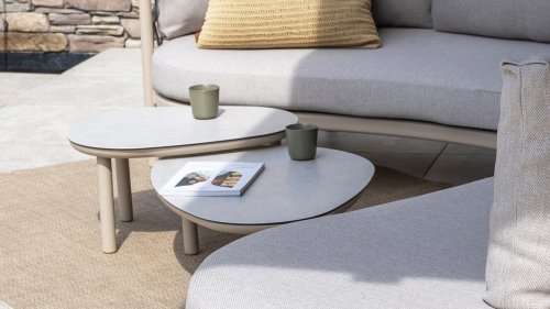 Verleihen Sie Ihrem Wohnraum einen Hauch von Eleganz und Raffinesse mit der Couchtischserie Monroe von Taste by 4 Seasons Outdoor. Dieses wunderschöne Set besteht aus zwei organisch geformten Tischen mit kieselsteinförmigen Tischplatten – verspielt und doch perfekt ausbalanciert. Dank seines unverwechselbaren Designs wird der Monroe zum stilvollen Blickfang in jedem Innen- und Außenbereich. Die Tischplatten bestehen aus bedruckter Keramik auf Glas und sorgen für eine luxuriöse Optik und eine langlebige, pflegeleichte Oberfläche. Der pulverbeschichtete Aluminiumfuß sorgt für eine stabile Basis und einen modernen, luftigen Look. Das Set ist in zwei Größen erhältlich – Ø65xH32cm und Ø80xH27cm – und lässt sich perfekt kombinieren oder einzeln zu einem dynamischen Ensemble kombinieren. Erhältlich in drei stilvollen Farben – Terre, Latte und Anthrazit – lässt sich der Monroe mühelos in Ihr Interieur oder Ihren Garten integrieren.