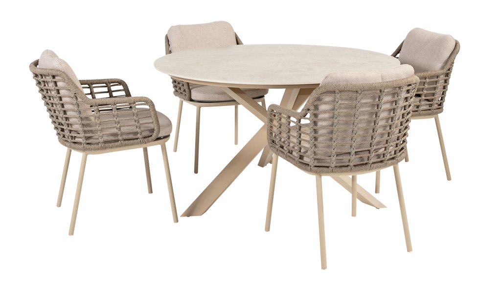 Holen Sie sich die warme, authentische Atmosphäre Süditaliens auf Ihre Terrasse. Diese Kollektion ist ein absolutes Muss für alle, die hochwertiges Design, organische Formen und höchsten Sitzkomfort suchen. Die Stärke der Puglia-Serie liegt in der gelungenen Materialkombination. Das Gestell besteht aus pulverbeschichtetem Aluminium – leicht und rostfrei. Rückenlehne und Armlehnen sind kunstvoll mit hochwertigem Seilgarn umflochten. Dadurch erhalten Stühle und Bänke eine offene, luftige Optik, die perfekt in den modernen Garten passt. Für zusätzlichen Komfort sind die Möbel mit Kissen aus Olefin-Gewebe ausgestattet. Dieses Material ist nicht nur wunderbar weich, sondern auch schmutzabweisend und wetterbeständig. So ist ein unerwarteter Sommerregen kein Problem. Die Taste 4Seasons Puglia-Serie ist in zwei wunderschönen Farbvarianten erhältlich, jede mit ihren eigenen, einzigartigen Möglichkeiten: