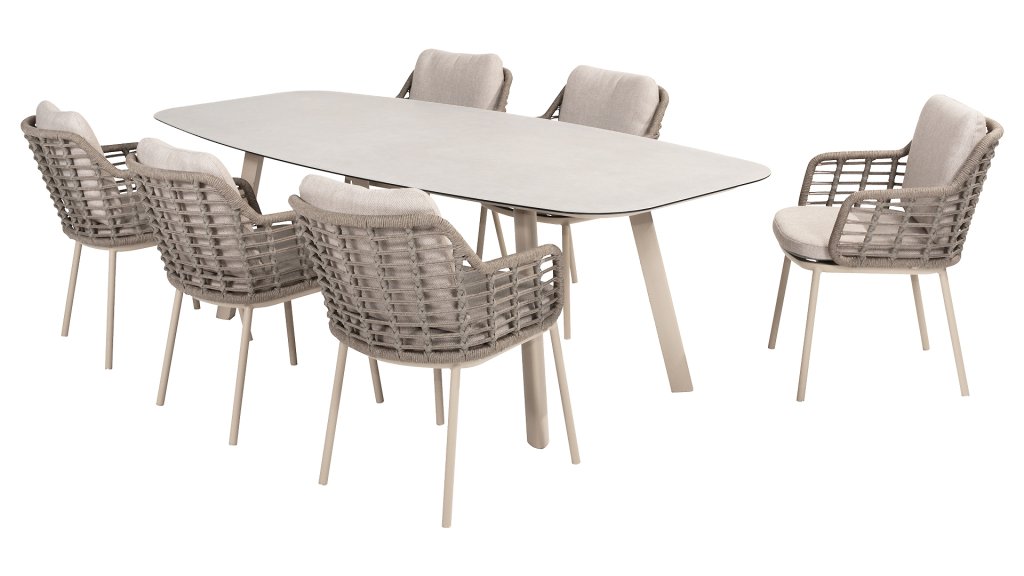 Holen Sie sich die warme, authentische Atmosphäre Süditaliens auf Ihre Terrasse. Diese Kollektion ist ein absolutes Muss für alle, die hochwertiges Design, organische Formen und höchsten Sitzkomfort suchen. Die Stärke der Puglia-Serie liegt in der gelungenen Materialkombination. Das Gestell besteht aus pulverbeschichtetem Aluminium – leicht und rostfrei. Rückenlehne und Armlehnen sind kunstvoll mit hochwertigem Seilgarn umflochten. Dadurch erhalten Stühle und Bänke eine offene, luftige Optik, die perfekt in den modernen Garten passt. Für zusätzlichen Komfort sind die Möbel mit Kissen aus Olefin-Gewebe ausgestattet. Dieses Material ist nicht nur wunderbar weich, sondern auch schmutzabweisend und wetterbeständig. So ist ein unerwarteter Sommerregen kein Problem. Die Taste 4Seasons Puglia-Serie ist in zwei wunderschönen Farbvarianten erhältlich, jede mit ihren eigenen, einzigartigen Möglichkeiten: