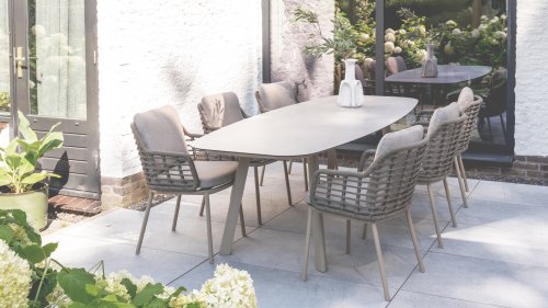 Suchen Sie einen pflegeleichten Tisch mit modernem Look? Dann sollten Sie den Taste by 4 Seasons Outdoor Manolo 240 cm in den Farben Anthrazit, Latte und Terre in Betracht ziehen. Die Form der Tischplatte und die Position der Aluminiumbeine machen diesen Tisch unglaublich praktisch. Diese Form schafft auf allen Seiten viel Platz. Das unverwechselbare Design des Tisches zeichnet sich durch eine dänische ovale Tischplatte aus glasbedruckter Keramik aus, sodass er das ganze Jahr über im Freien stehen kann. Kein Platz für einen 240 cm langen Tisch? Alternativ gibt es den Taste 4 Seasons Manolo 75cm oder 180cm; beide Größen sind in den Farben Latte, Anthrazit und Terre erhältlich.