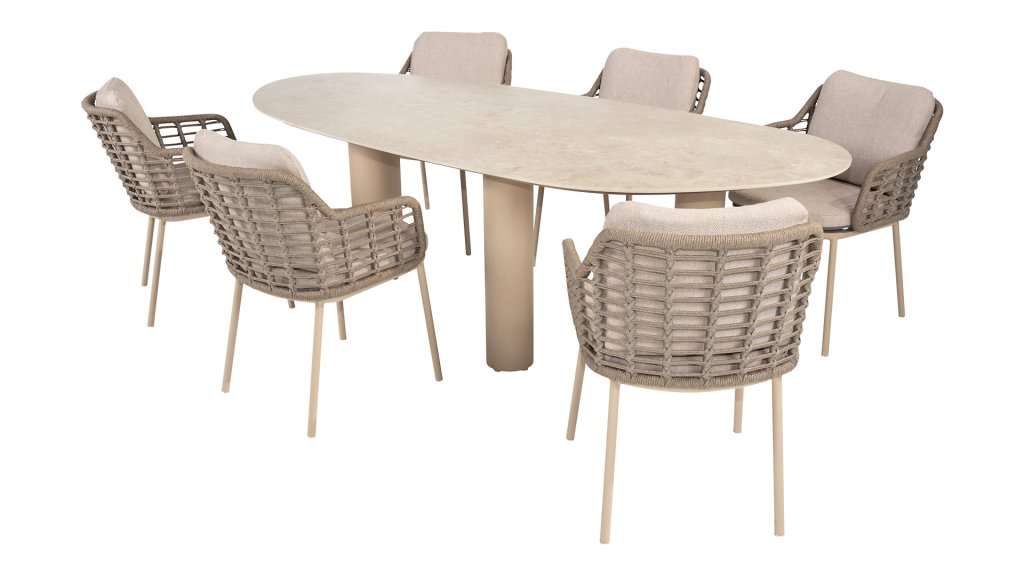 Holen Sie sich die warme, authentische Atmosphäre Süditaliens auf Ihre Terrasse. Diese Kollektion ist ein absolutes Muss für alle, die hochwertiges Design, organische Formen und höchsten Sitzkomfort suchen. Die Stärke der Puglia-Serie liegt in der gelungenen Materialkombination. Das Gestell besteht aus pulverbeschichtetem Aluminium – leicht und rostfrei. Rückenlehne und Armlehnen sind kunstvoll mit hochwertigem Seilgarn umflochten. Dadurch erhalten Stühle und Bänke eine offene, luftige Optik, die perfekt in den modernen Garten passt. Für zusätzlichen Komfort sind die Möbel mit Kissen aus Olefin-Gewebe ausgestattet. Dieses Material ist nicht nur wunderbar weich, sondern auch schmutzabweisend und wetterbeständig. So ist ein unerwarteter Sommerregen kein Problem. Die Taste 4Seasons Puglia-Serie ist in zwei wunderschönen Farbvarianten erhältlich, jede mit ihren eigenen, einzigartigen Möglichkeiten:
