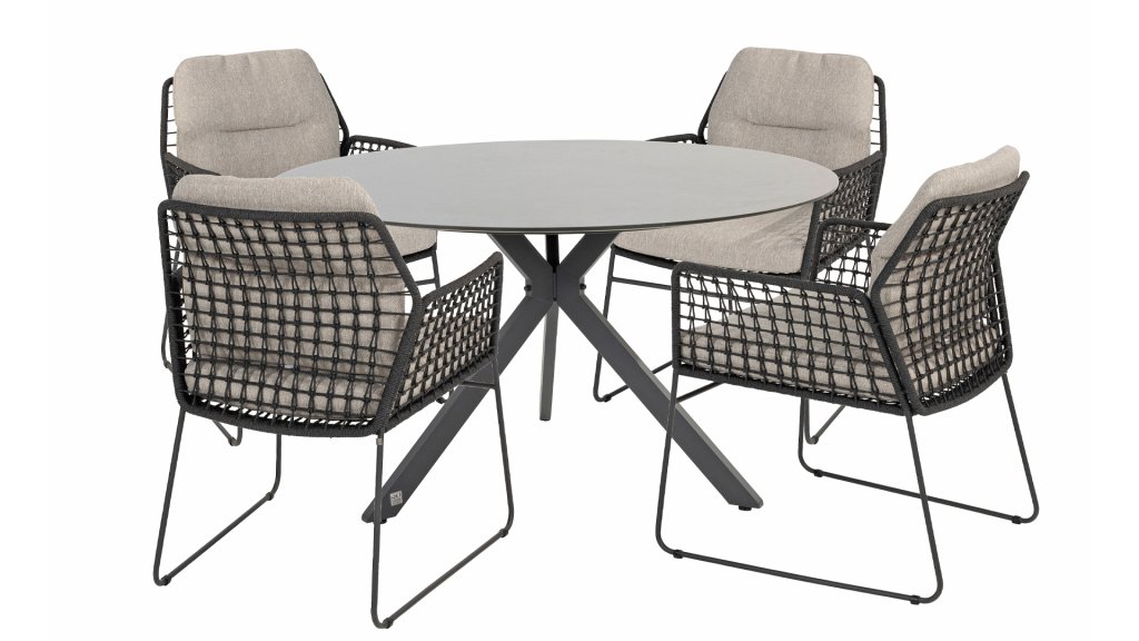 Der Locarno Tisch von 4 Seasons Outdoor ist sehr pflegeleicht. Die HPL-Platte in Schiefer-Antazit verleiht Ihrer Terrasse ein modernes und elegantes Aussehen. Im dunklen Anthrazit sind helle Adern zu sehen, die dem Blatt ein natürliches Aussehen verleihen. Das Kreuzbeingestell verleiht dem Tisch ein modernes und elegantes Aussehen. Um es noch lustiger und praktischer zu machen, ist auch ein Drehteller erhältlich. Der Tisch ist auch im Format Ø160cm erhältlich.