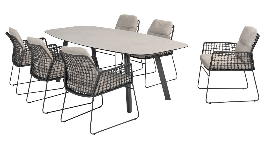 Suchen Sie einen pflegeleichten Tisch mit modernem Look? Dann schauen Sie sich den Taste by 4 Seasons Outdoor Manolo 240cm, verfügbar in der farben Anthrazit, Latte und Cloud erhältlich ist. Die Form der Tischplatte und die Position der Aluminium-Tischbeine machen diesen Tisch sehr praktisch. Die Form schafft ausreichend Platz auf allen Seiten des Tisches. Der Tisch zeichnet sich durch die dänische ovale Tischplatte aus Glass Printed Keramik aus, sodass der Tisch das ganze Jahr über draußen bleiben kann. Kein Platz für einen 240 cm Tisch? Dann könnte der Taste 4 Seasons Manolo 75 cm eine Alternative sein, erhältlich in Latte und Anthrazit.