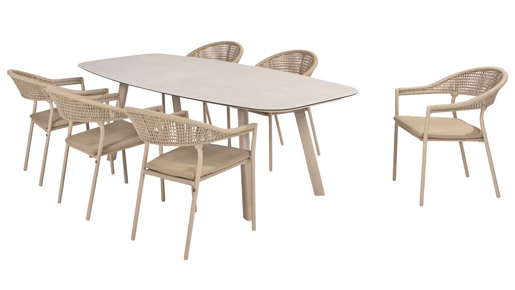 Die Terrassenmöbelserie Taste Sienna besticht durch ihren einzigartigen Stil, der durch moderne Seilelemente noch unterstrichen wird! Die Schönheit liegt im Detail. Die Rückenlehne der Sienna-Essgruppe von Taste by 4Seasons ist aus Seil geflochten und bietet so eine stabile und zugleich bequeme Sitzfläche. Das Gestell erzeugt ein verspieltes und minimalistisches Zusammenspiel fließender Linien und bildet eine solide Basis. Ein wahrer Augenschmaus! Die Sienna ist in den Farben Latte, Terre und Anthrazit erhältlich.