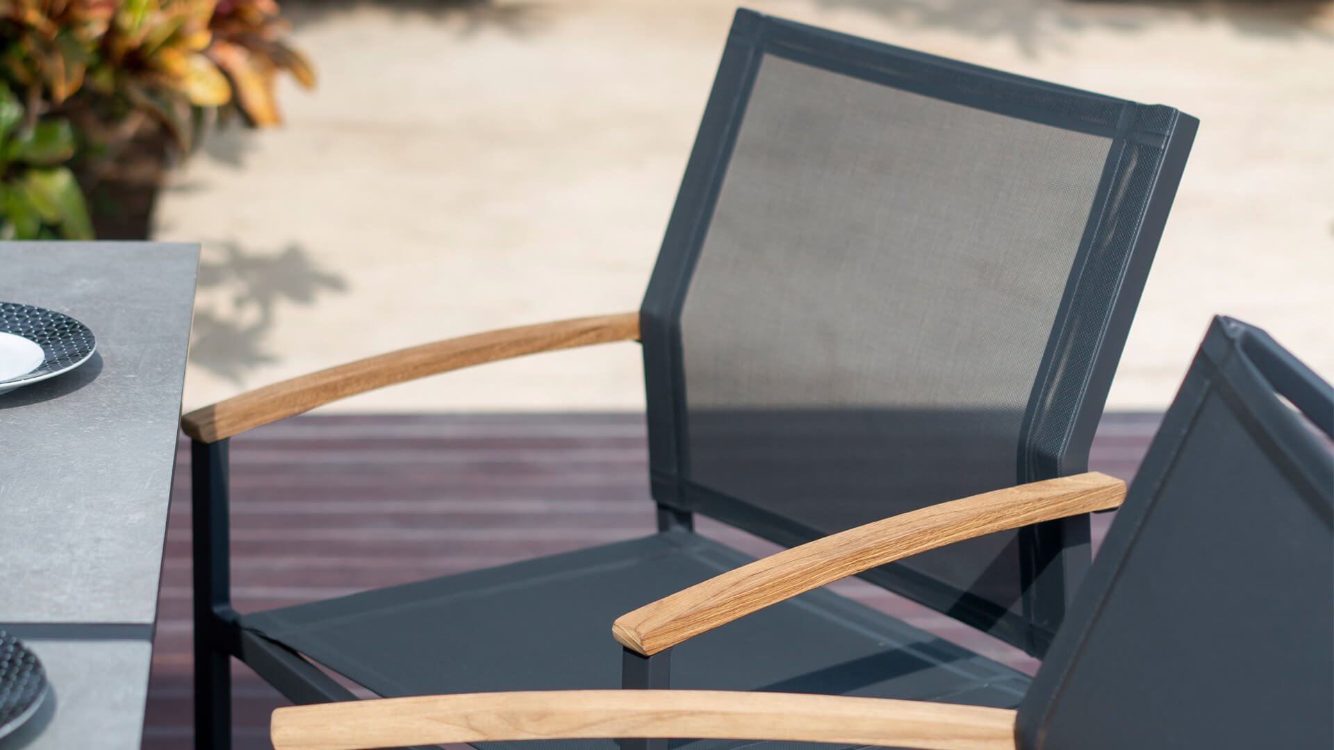 Der Stapelsessel Alex von Zebra überzeugt durch elegantes, modernes Design. Die hochwertige Materialkombination garantiert Langlebigkeit. Der Gartenstuhl passt hervorragend in nahezu jedes Gartenambiente. Als Stapelsessel ist er zudem schnell verstaut, sollten Sie ihn einmal nicht benötigen. Der Sessel gehört zur Serie greenline von Zebra, die sich durch hochwertige Materialien und zeitloses Design auszeichnet. Greenline steht für höchsten Qualitätsanspruch. Verfügt über ein Gestell aus hochwertigem Aluminium sowie eine erstklassige Bespannung aus Batyline®-Textilgewebe in ebony. Die Armlehnen sind aus exklusivem Teakholz gefertigt und sorgen für eine angenehme Haptik. Bei die Styx Sessel sind die Armlehnen aus Teakholz mit Drifwood-Finish. Das Textilgewebe ist absolut reißfest, UV-beständig und auch bei hoher Beanspruchung formstabil. Holzfans werden sich am warmen und harmonischen Charakter des Teakholzes erfreuen. Dieses ist absolut wetterfest und robust. In Kombination mit Phönix Tischen und Bänken sehr schön!