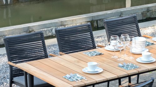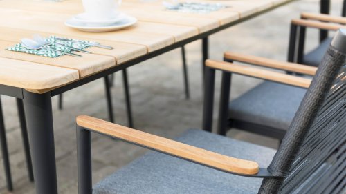 Der Gartentisch Styx aus der Serie Greenline der Marke Zebra ist modern, innovativ, vielseitig und vor allem qualitativ äußerst hochwertig. Der Tisch ist ein Design-Highlight in jedem Innen- und Außenbereich. Besonders auffallend ist die Tischplatte aus HPL, die mit zwei zentralen Applikationen (schmalen Streifen) in graphitfarbenem Aluminium (pulverbeschichtet) hervorsticht. Charakteristisch sind auch die kantigen Tischbeine aus recyceltem Teakholz. Verfügt über Tischbeine aus erstklassigem, recyceltem Teakholz. Holzfans werden sich an dem warmen, weichen Charakter des recycelten Teakholzes erfreuen. Dieses stammt aus alten Häusern, Brücken oder Schiffen und wird mit viel Handwerkskunst und Fachwissen wieder aufgearbeitet. Astlöcher, Kerben, Unebenheiten, Ausbesserungsstellen oder Rillen sind absolut charakteristisch für diese Unikate und unterstreichen Ihren aussergewöhnlichen, einzigartigen Look. Die Tischplatte ist aus HPL (scratched grey) und verfügt über zwei zentrale Applikationen aus graphitfarbenem Aluminium. HPL (High Pressure Laminate) besteht aus mehreren beschichteten Dekorpapieren, die miteinander zu einer starken Platte verbunden werden. HPL ist besonders kratzfest, wetterfest, UV-beständig und langlebig. Zudem können dem Material auch hohe Temperaturschwankungen nichts anhaben.