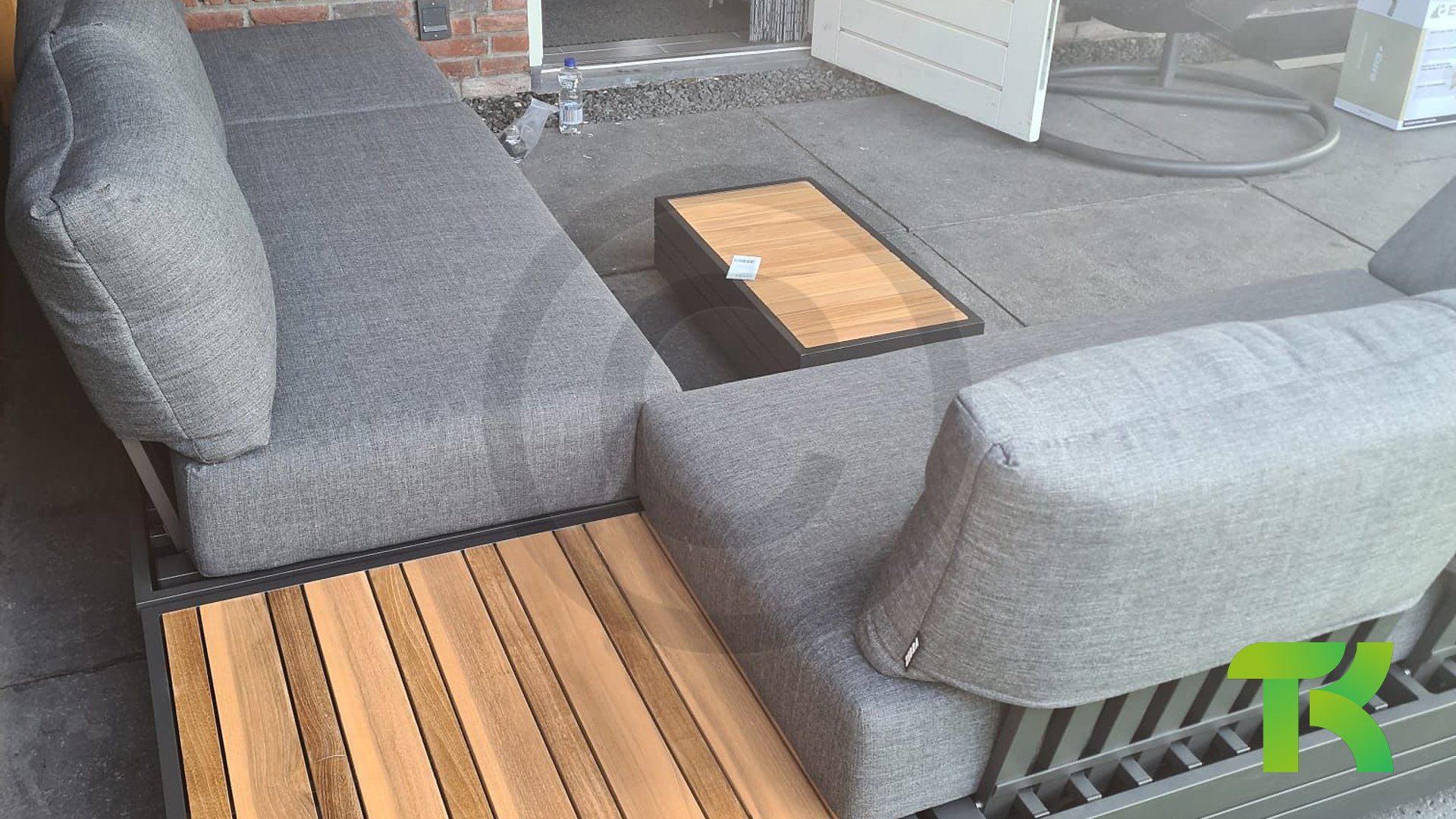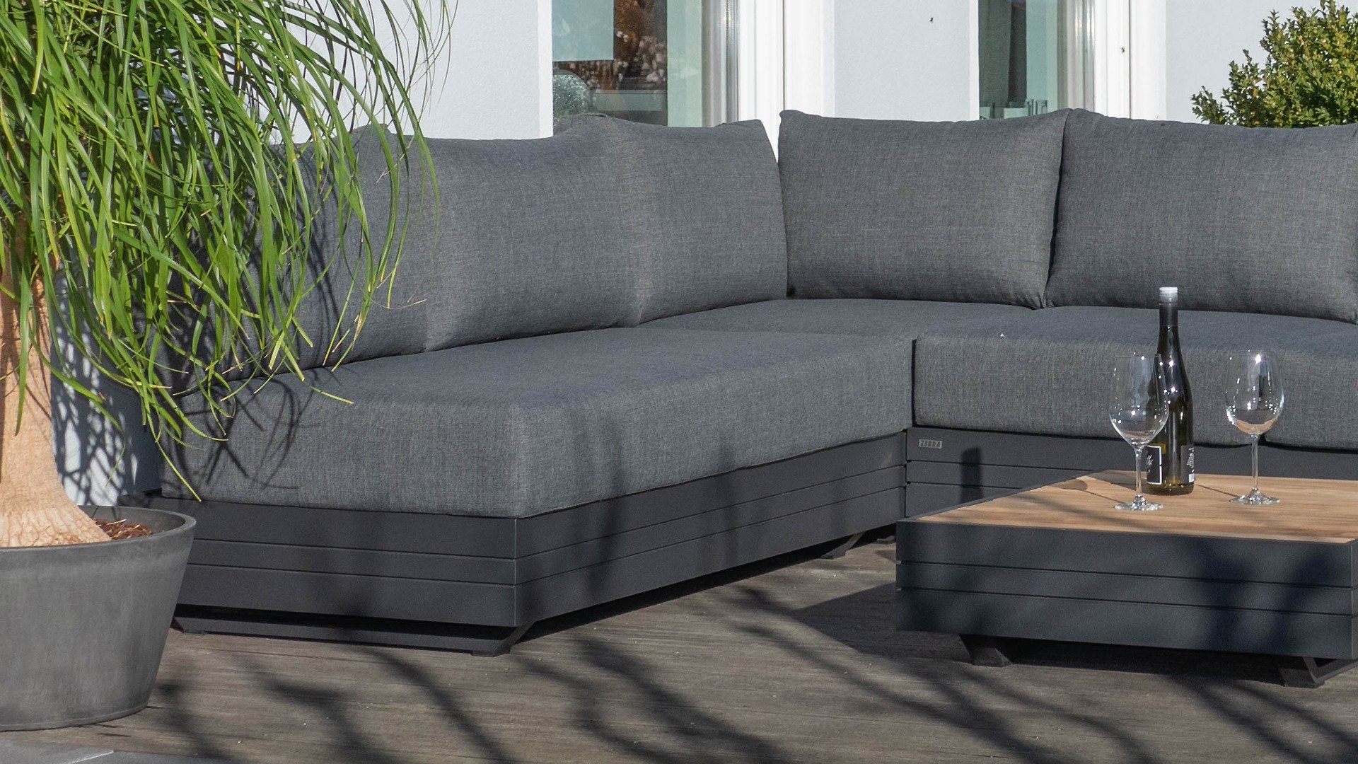 Ihr Set Cubo Lounge verfügt über einen verstellbaren 3-Sitzer und einen 1-Sitzer. Das Gestell besteht aus pulverbeschichteten Aluminium in der Farbe graphite und die Ablage-Elemente aus zertifiziertem Teakholz. Aluminium vereint ein geringes Gewicht mit einer hohen Robustheit. Teakholz gilt als das beste Holz für Möbel im Außenbereich. Es muss nicht imprägniert oder besonders schutzbehandelt werden. Der hohe Gehalt an natürlichen Ölen macht das Holz besonders witterungsbeständig. Im Laufe der Zeit bekommt Teak eine unverwechselbare, silbergraue Patina. Das ist normal und beeinträchtigt die Qualität und Lebensdauer des Moduls in keiner Weise. Teak lässt sich einfach und schnell reinigen und pflegen.
